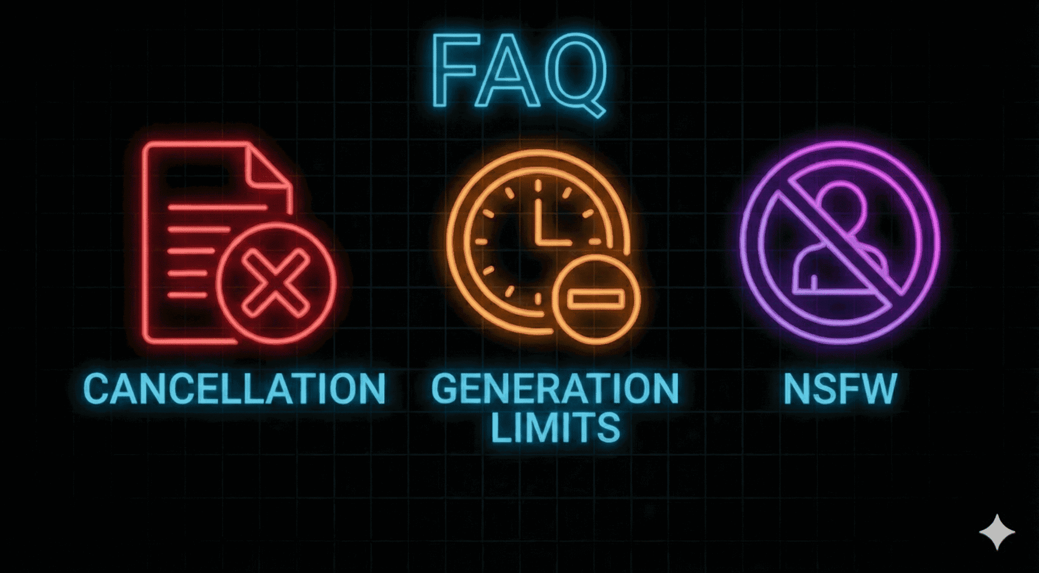 よくある質問は、解約の扱いや生成制限、禁止事項(NSFWを含む)です。3つの質問をまとめています。