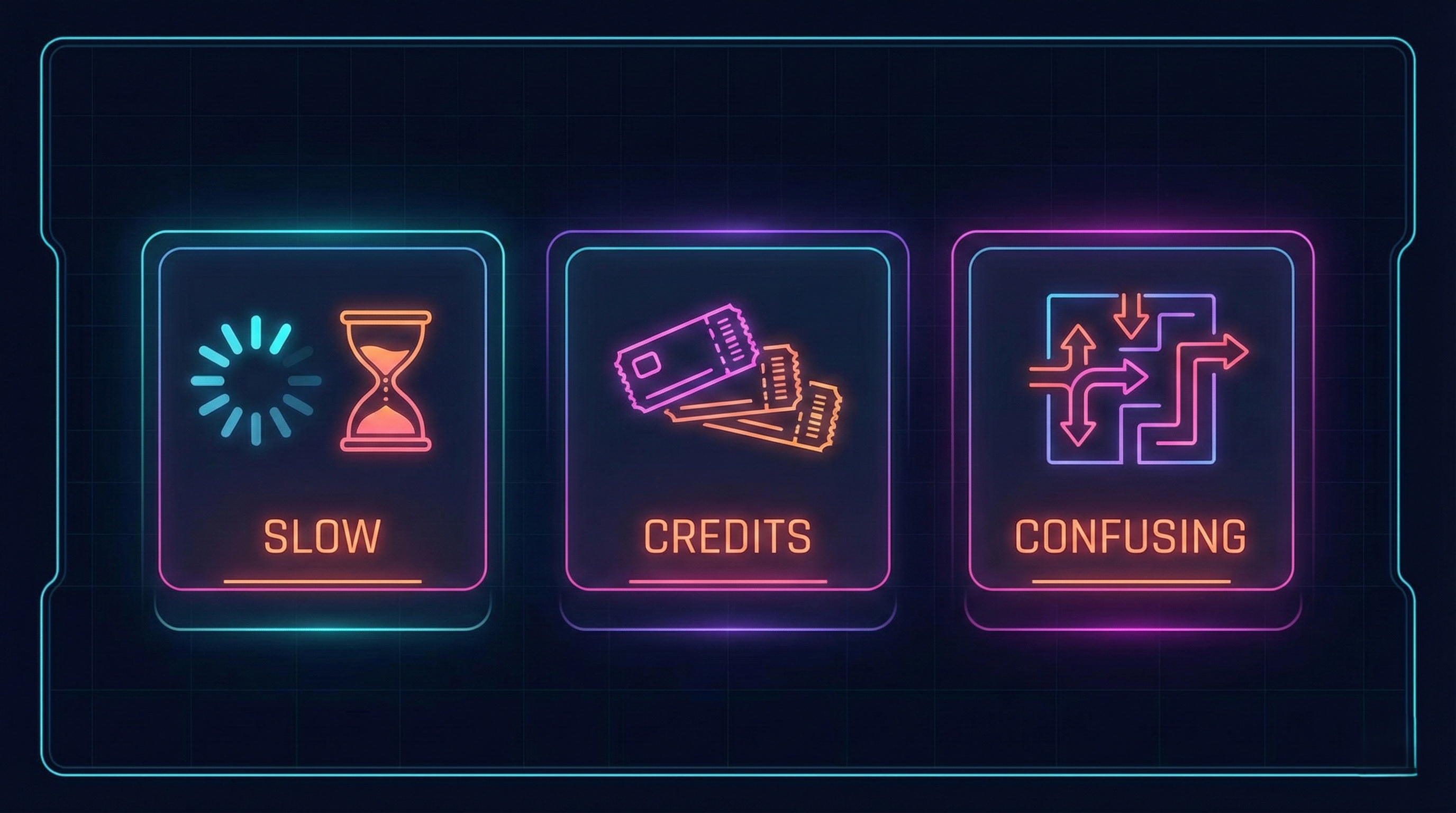 悪い口コミは「遅い」「思ったよりクレジットが減る」「操作に迷う」が中心です。不満はツールの欠点というより、運用の前提と噛み合わないときに増えます。ここを先に理解しておくと、無料での検証の質が上がります。