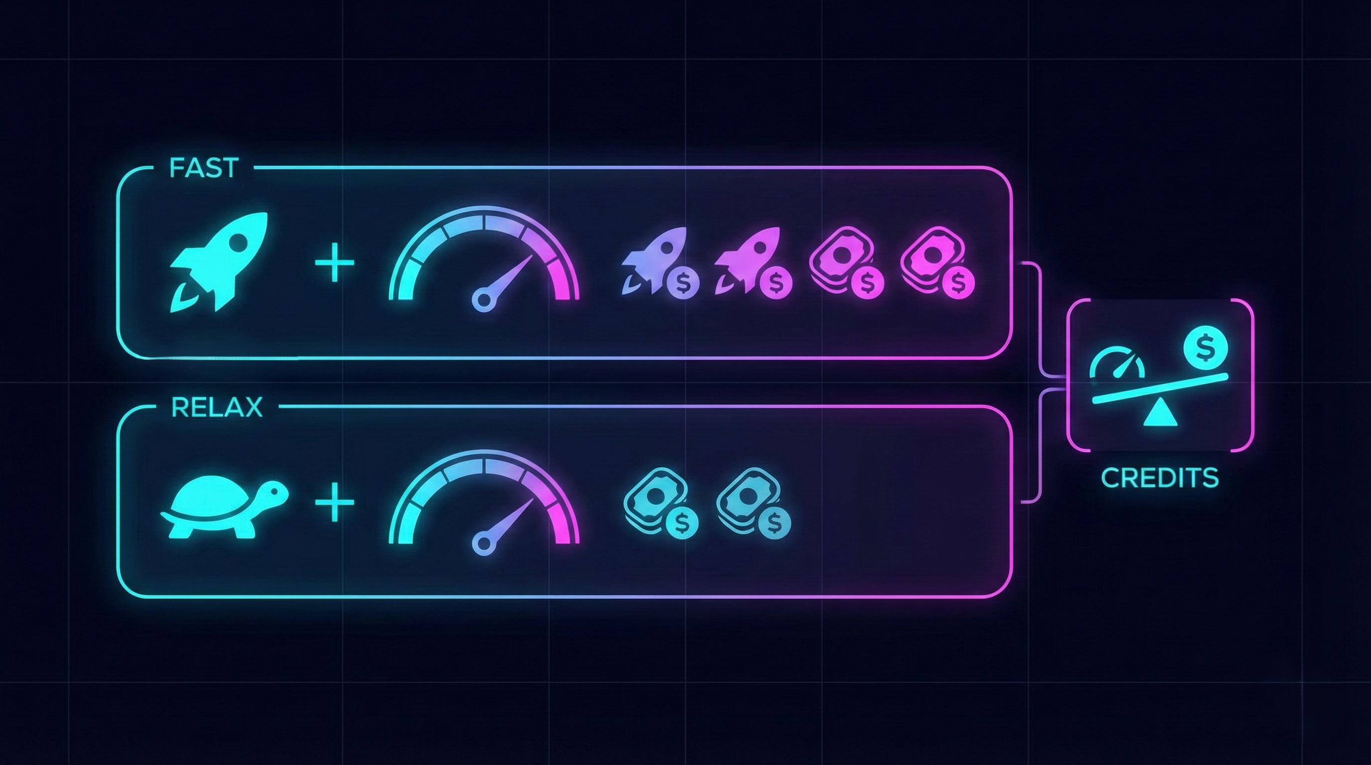 Fastモードはクレジットを消費して処理を優先し、Relaxモードはクレジットを消費しない代わりに処理が長くなります。「試作はRelax、仕上げはFast」のように工程で分けると、速度と消費の両方を納得しやすい形に寄せられます。