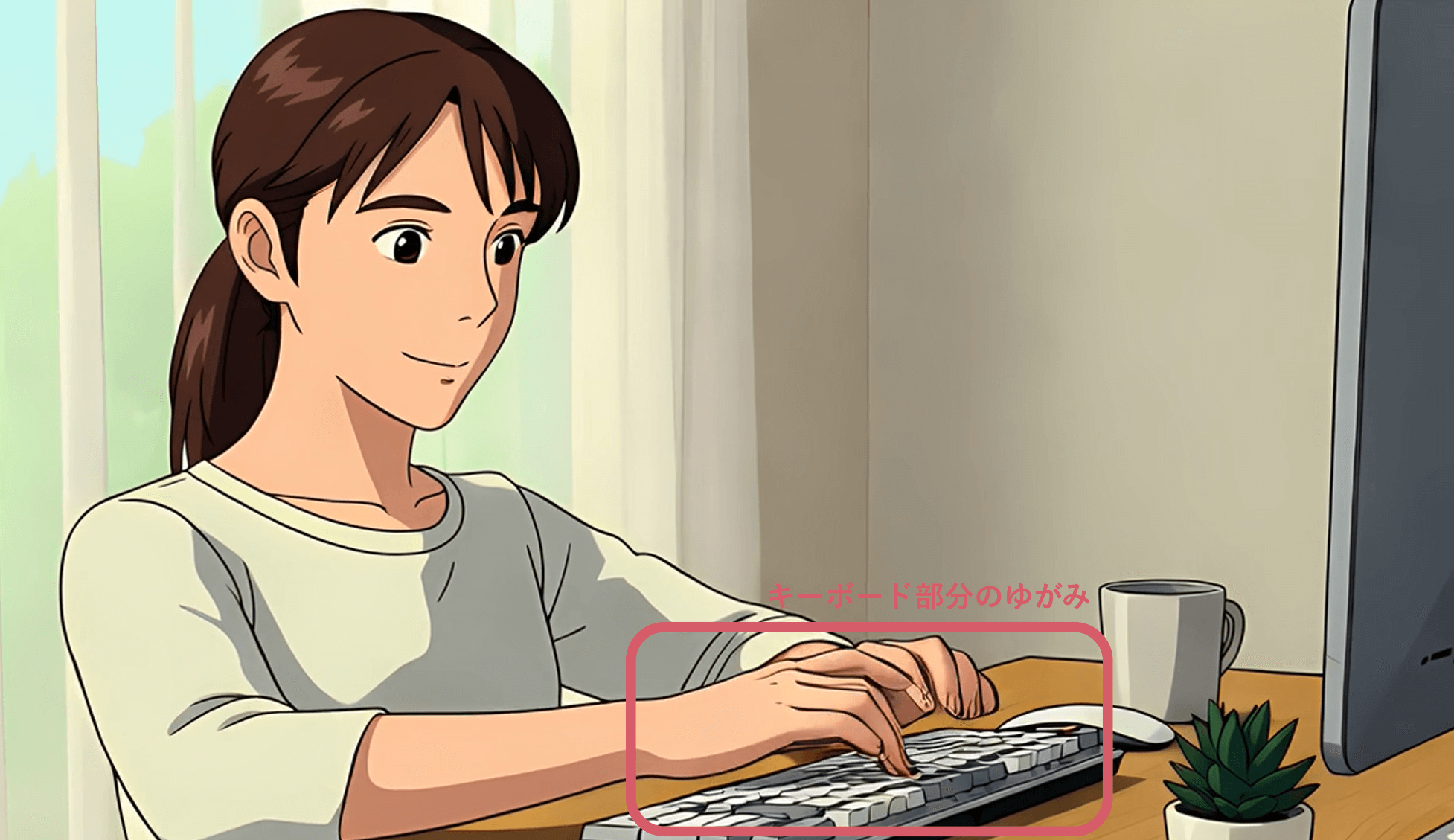 タイピング中心のシンプルで動きの少ない動画でも、キーボードに指先が接触する部分で歪みが強く出ました。