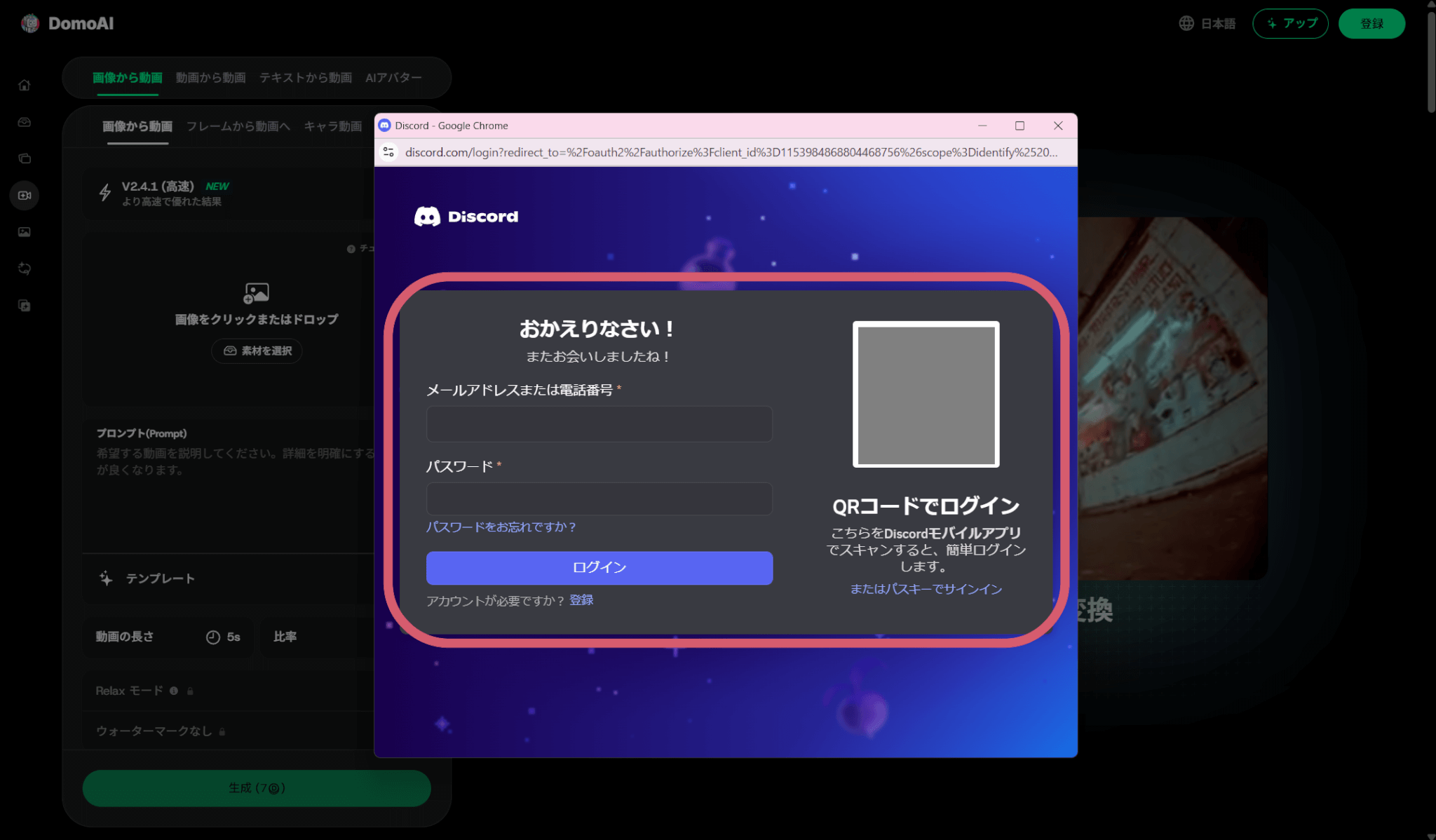 DiscordかGoogleでログインが選択できるのでDiscordを選択し、Discordのアカウントでログイン