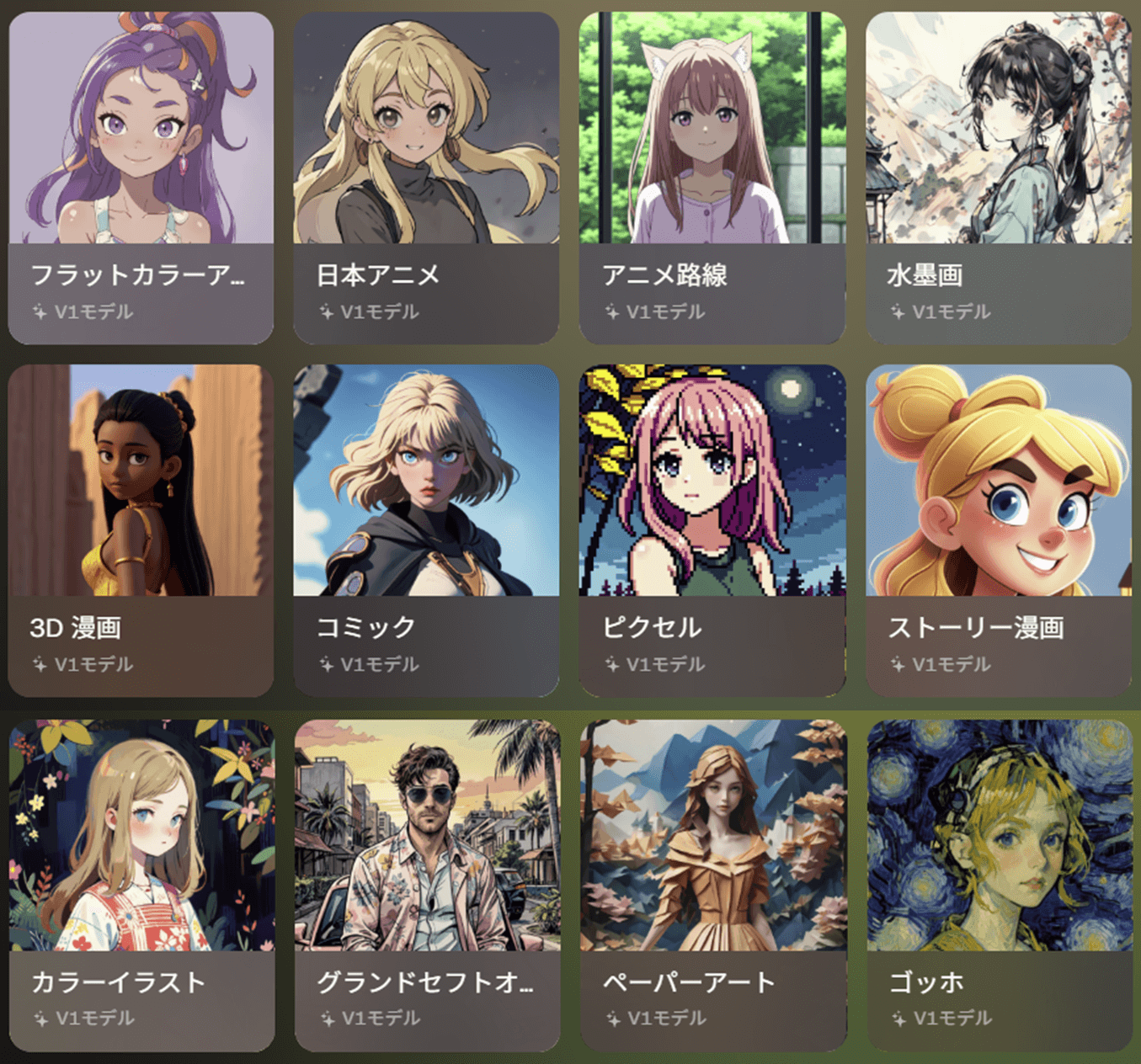 | 1.0 Model | フラットカラーアニメ 日本アニメ アニメ路線 水墨画 3D漫画 コミック ピクセル ストーリー漫画 カラーイラスト グランドセフトオート風 ペーパーアート ゴッホ |