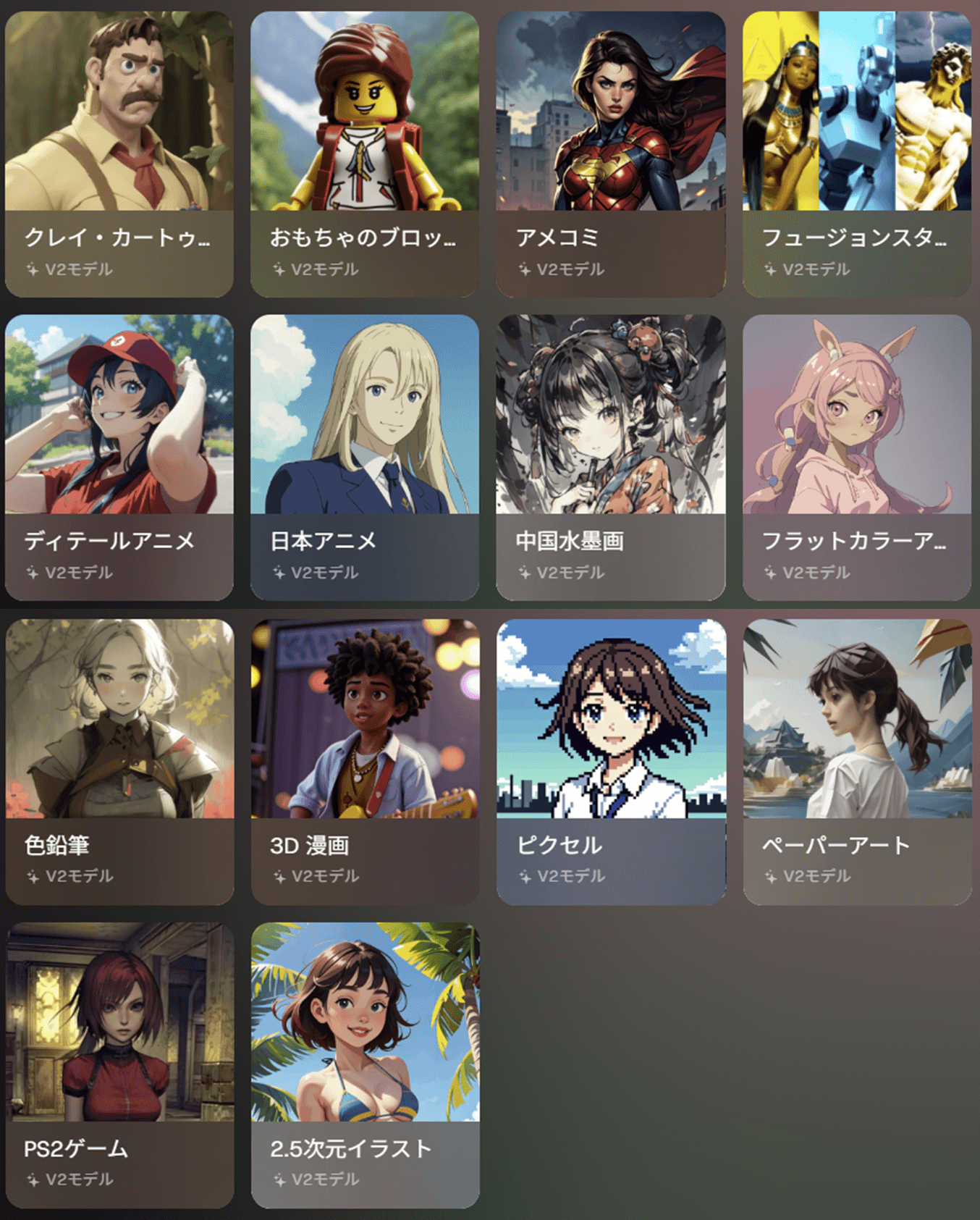 | 2.0 Model | クレイ・カートゥーン おもちゃのブロック アメコミ フュージョンスタイル ディテールアニメ 日本アニメ 中国水墨画 フラットカラーアニメ 色鉛筆 3D漫画 ピクセル ペーパーアート PS2ゲーム 2.5次元イラスト |