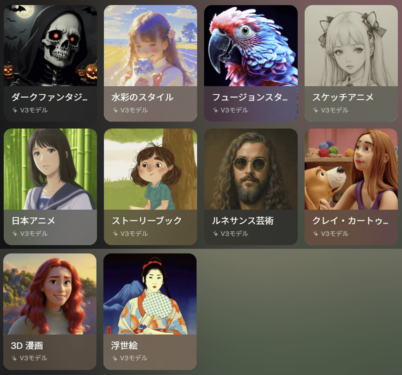 | 3.0 Model | ダークファンタジー 水彩のスタイル フュージョンスタイル スケッチアニメ 日本アニメ ストーリーブック ルネサンス芸術 クレイ・カートゥーン 3D漫画 浮世絵 |