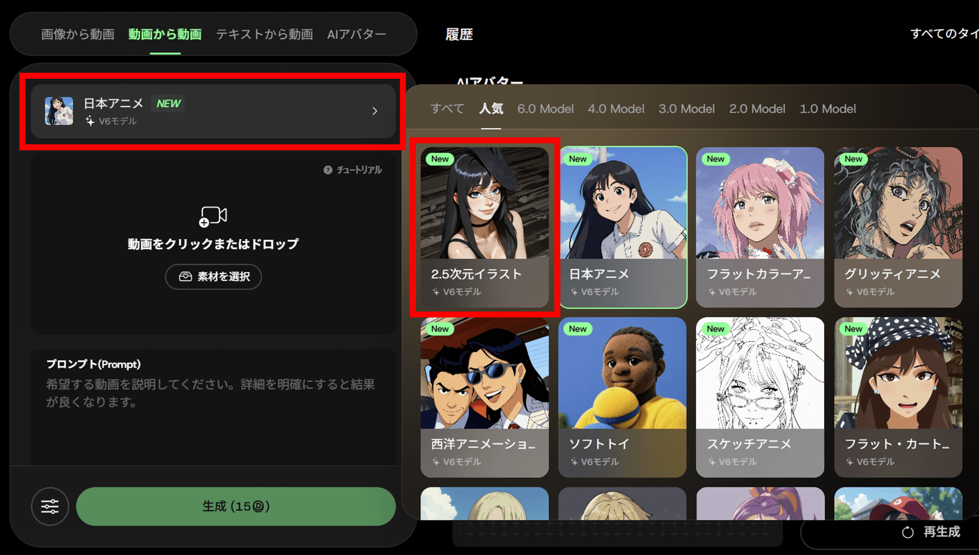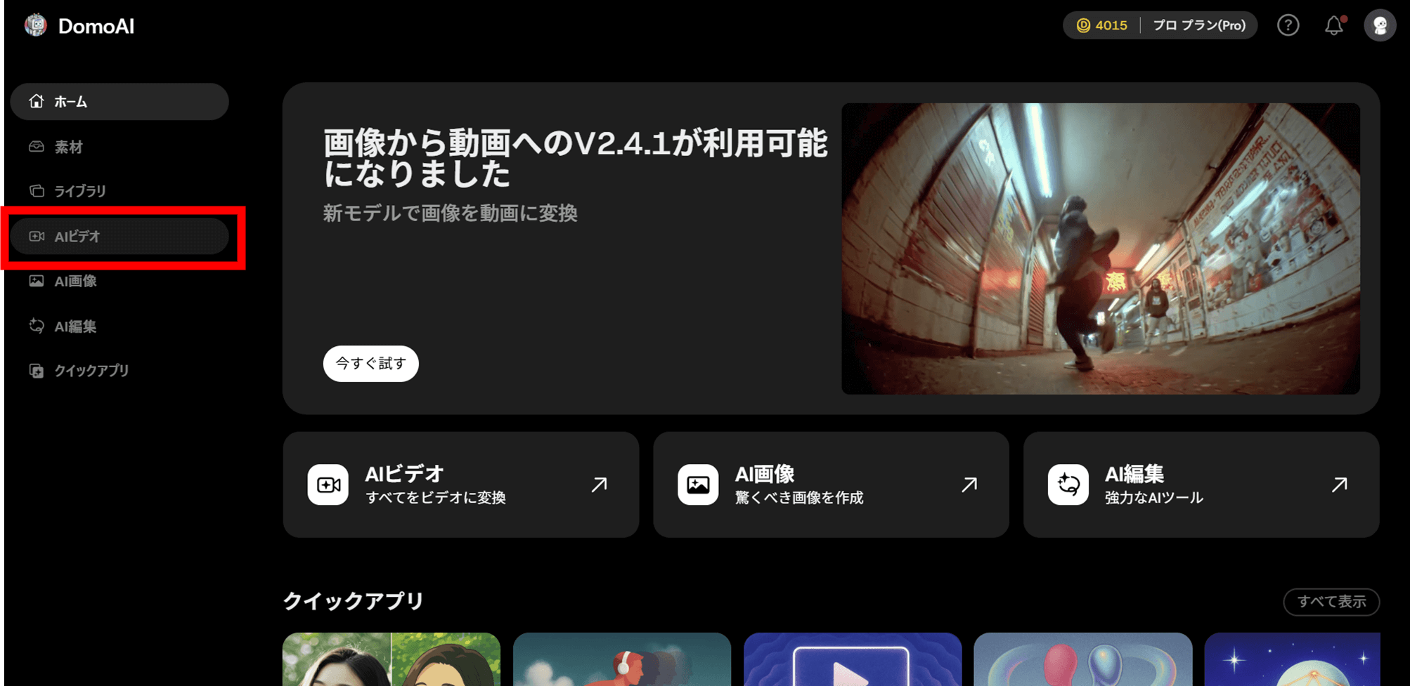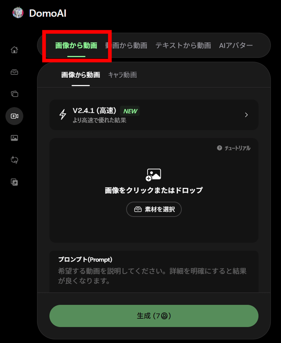 AIビデオのメニュー内で、「画像から動画」を選択します。