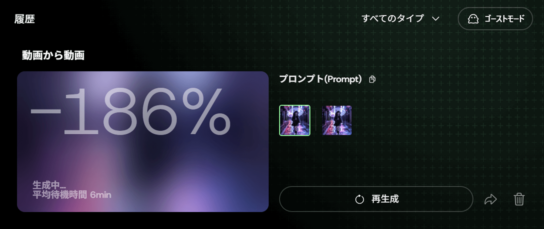 動画の生成を開始すると右側の「履歴」欄に進捗が表示されます。