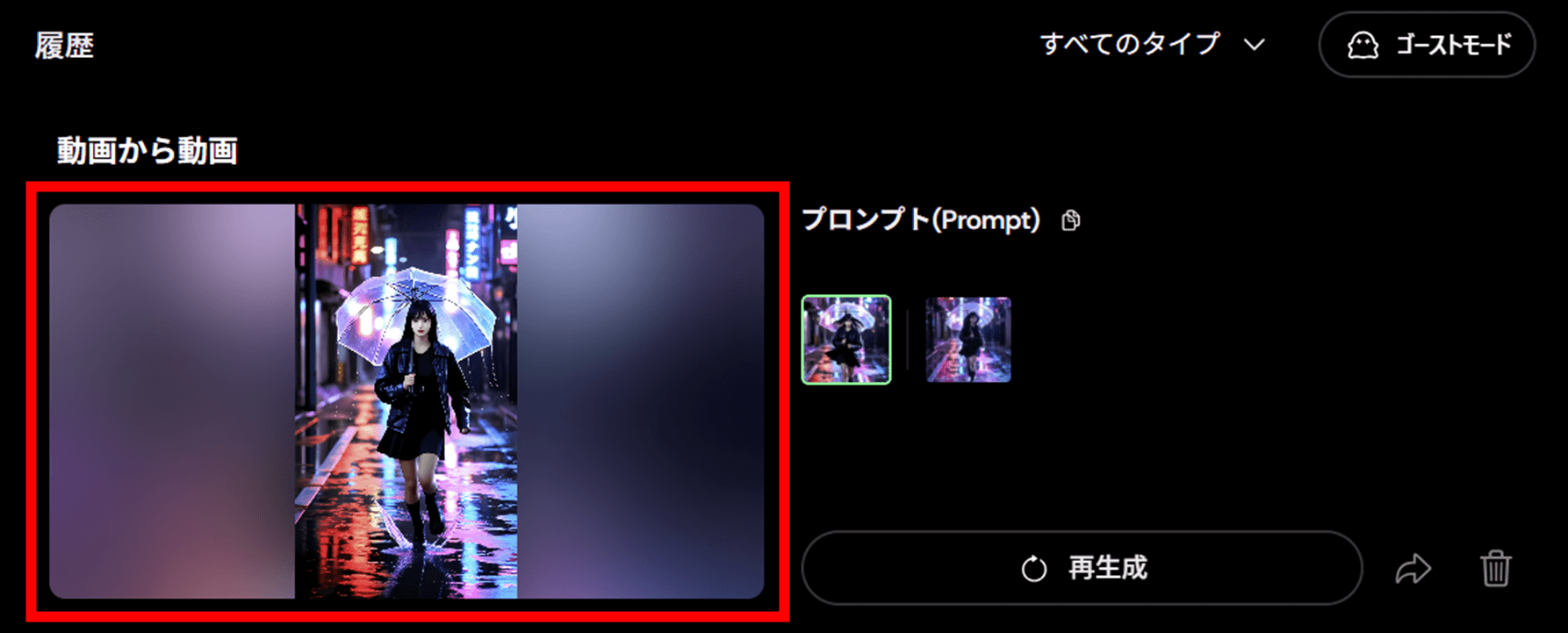 3sの動画の場合、生成には目安として数分ほどかかります。完了するとプレビューが表示されますので、このエリアにカーソルを合わせるか、クリックすると動画を再生することができます。