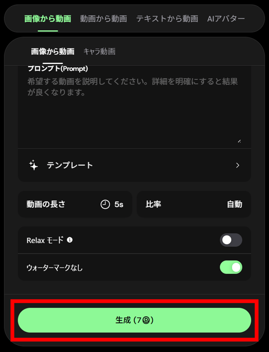 また、動画の長さ(5sもしくは10s)や比率、Relaxモードやウォーターマークの有無についても先ほどと同様に設定を確認し、「生成」をクリックします。