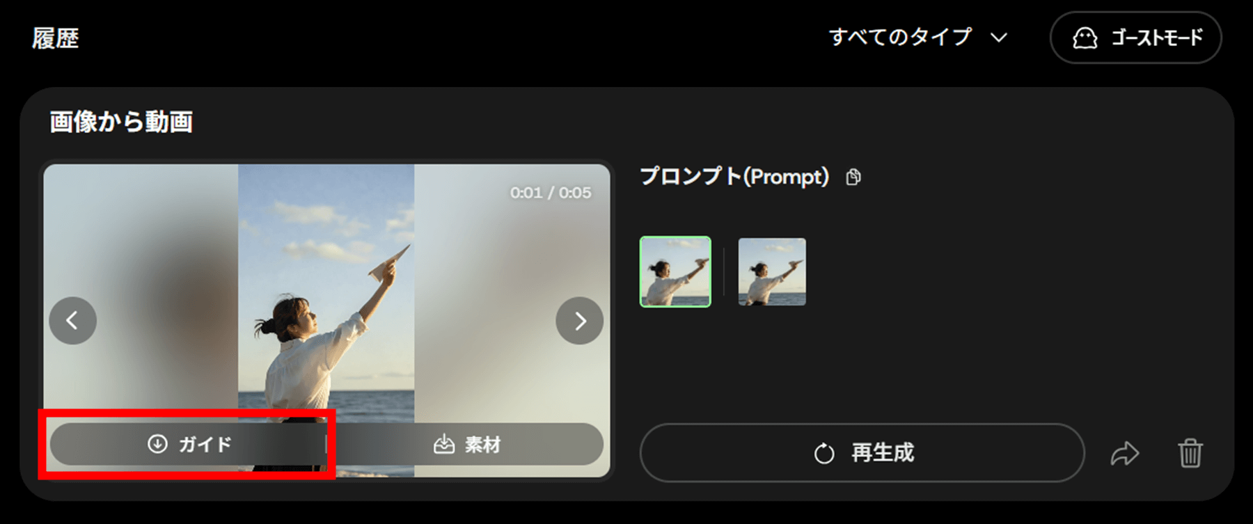 動画が生成されたら履歴欄にプレビューが表示されます。「ガイド」をクリックして保存することができます。