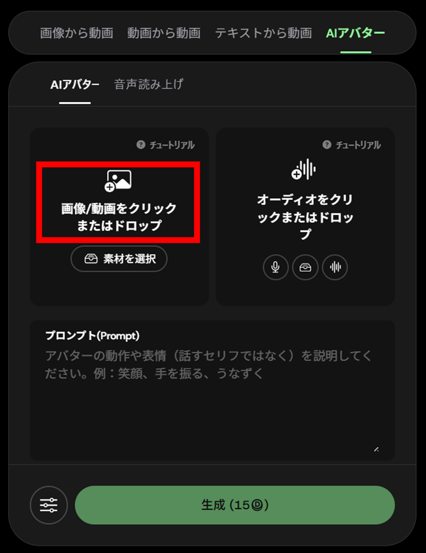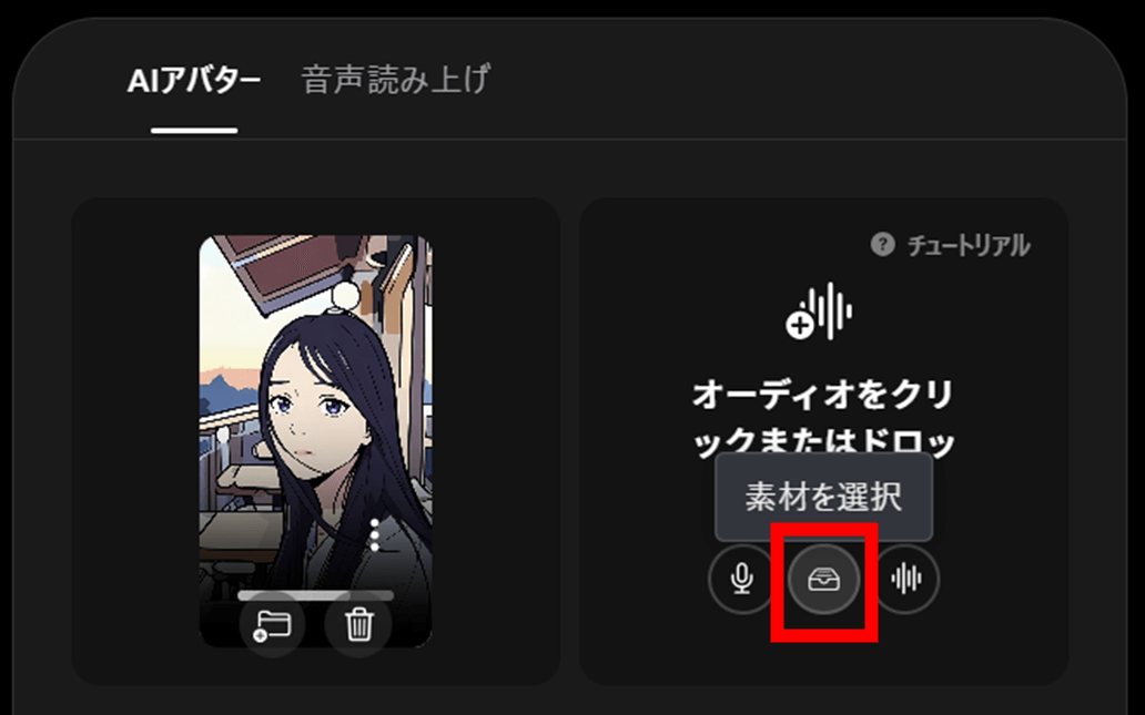 「AIアバター」のメニューに戻り、「素材を選択」のアイコンをクリックします。