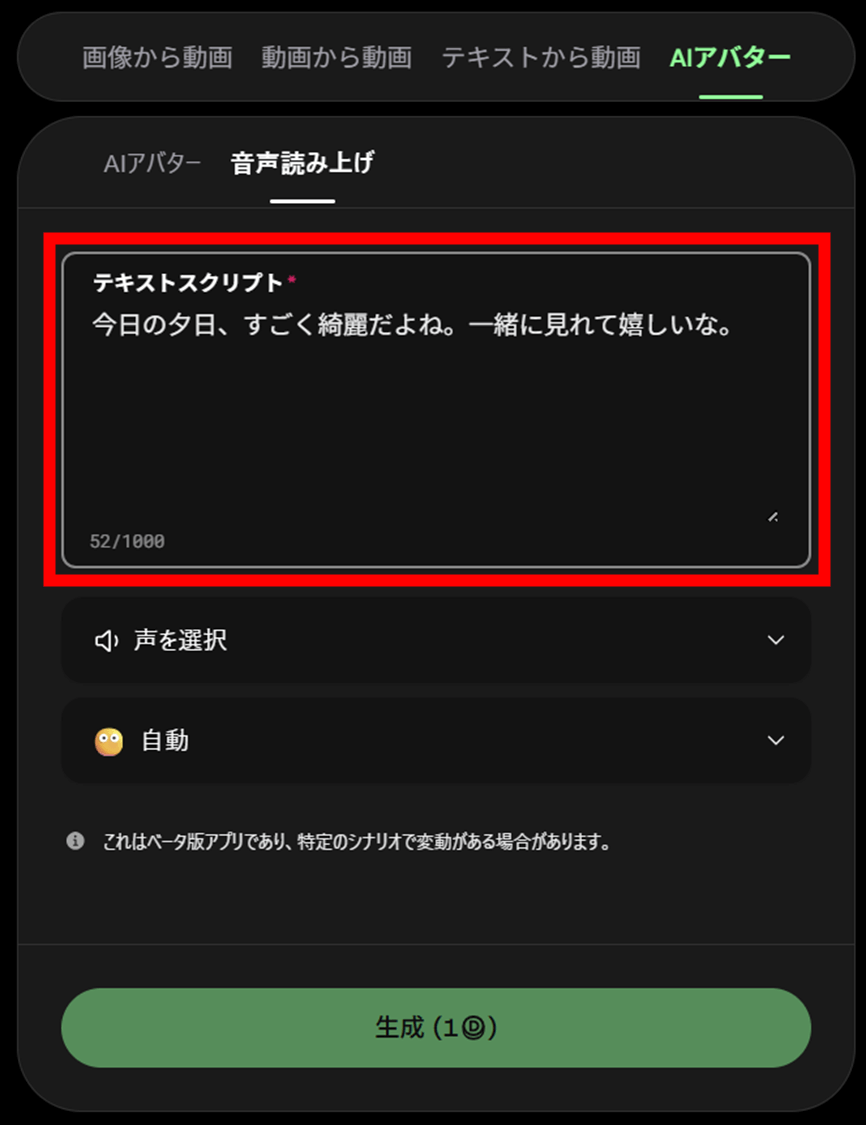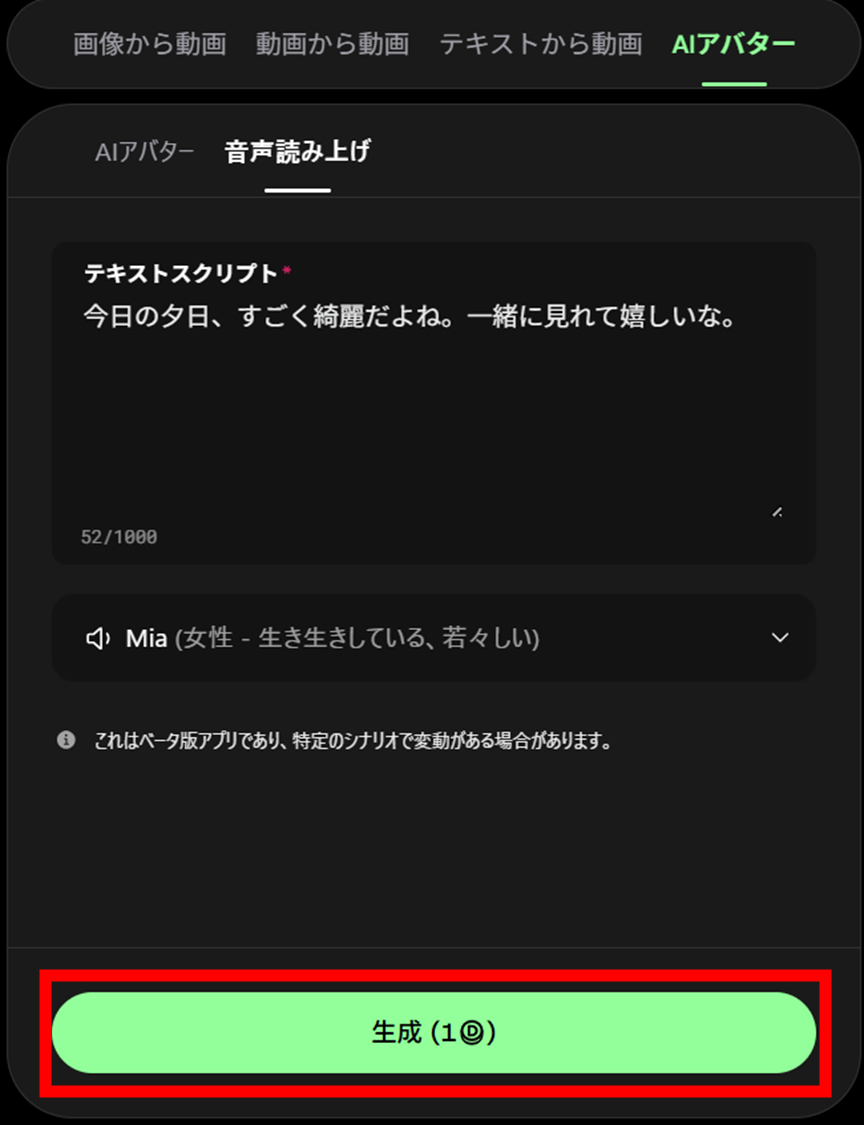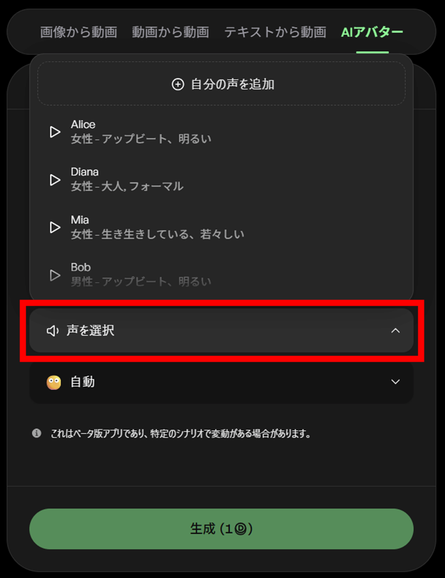 セリフや歌声をあとから追加できるため、AIフィルターで動画生成(動画から動画)で変換した映像にも自然に声を乗せられます。