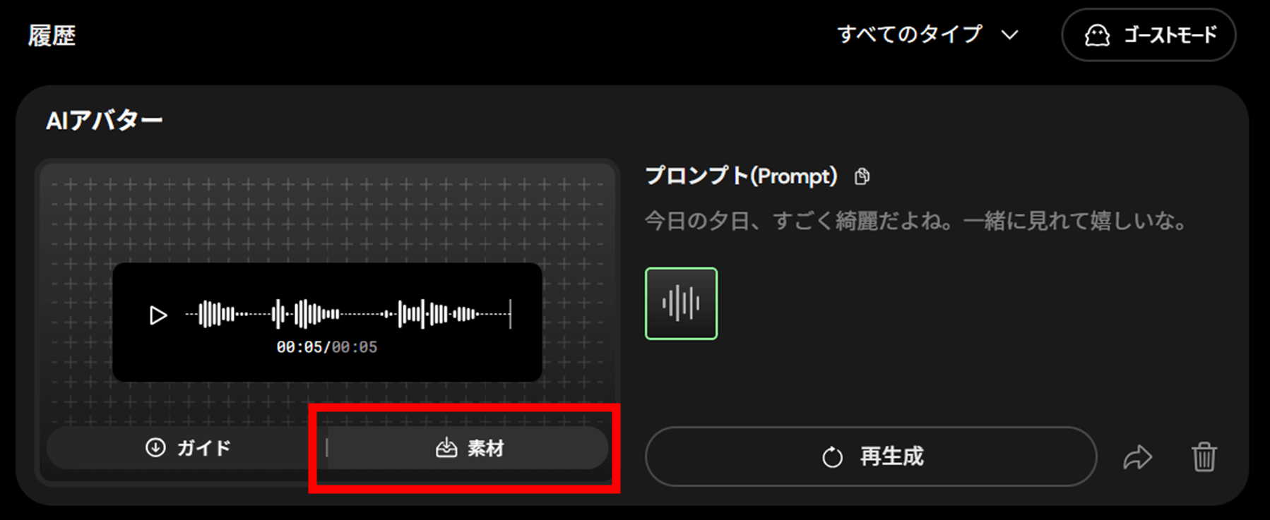 右側の履歴欄に生成結果が表示されますので、「素材」をクリックします。