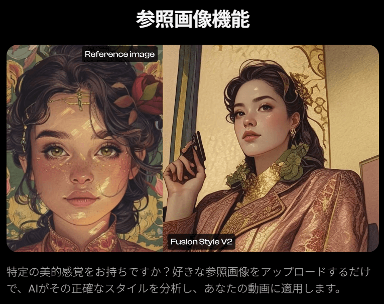 とくに特徴的なスタイルは、2.0model、3.0modelから選べる「フュージョンスタイル」です。プリセットだけに依存せず、参照画像とテキストによるプロンプトを組み合わせてスタイルを作り込めます。
