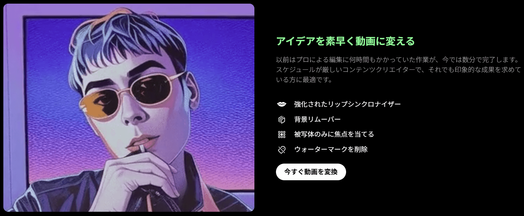 また、画像から動画やリップシンクと組み合わせることで自由度が高まり、映像の完成度も上がります。
