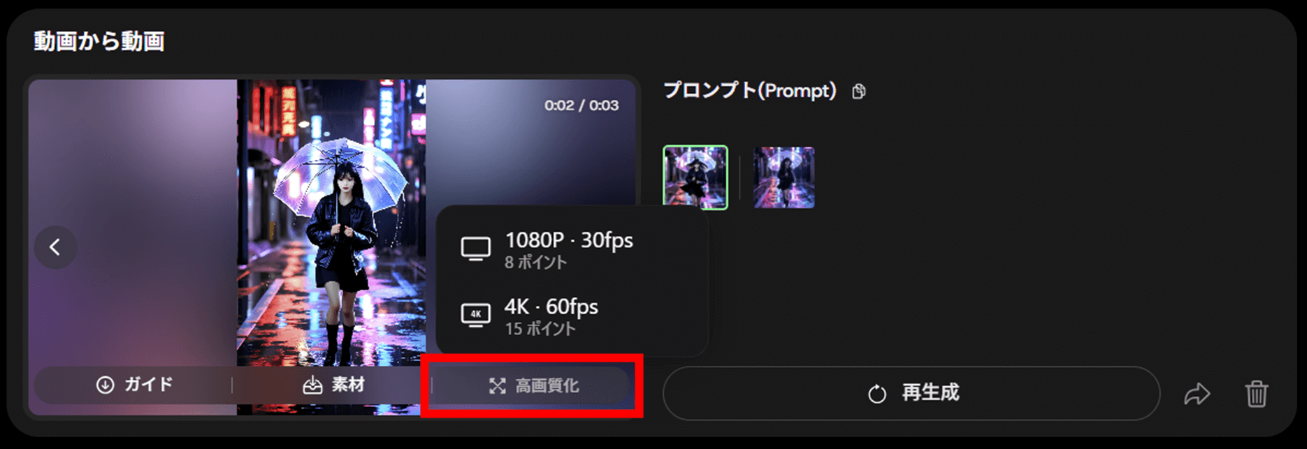 DomoAIは4K出力に対応しており、必要に応じてアップスケール機能を使えば4K相当に高精細化できます。アップスケールは生成履歴の各動画のプレビュー画面にカーソルを当てると表示される「高画質化」から行うことができます。