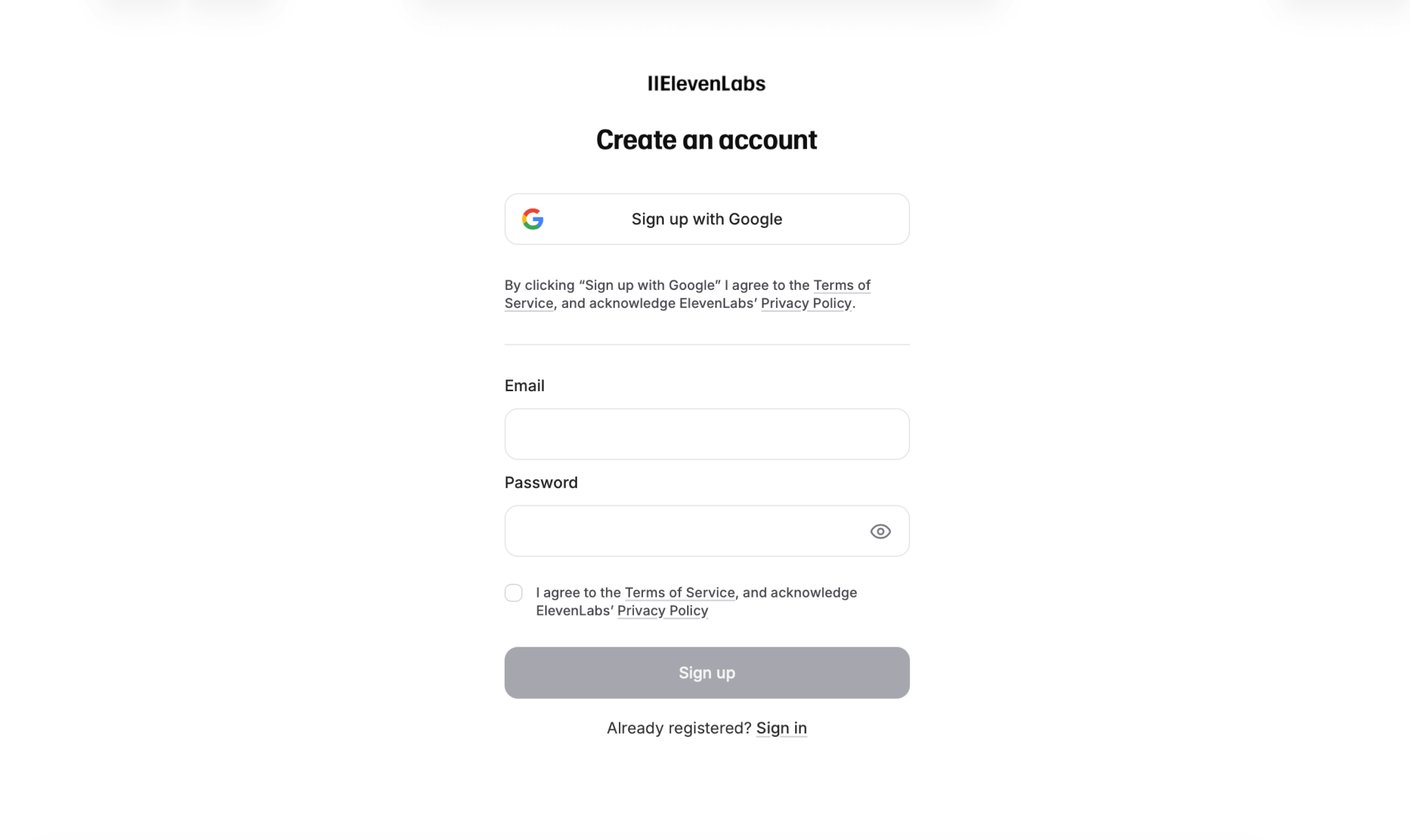 ElevenLabsの公式サイトからサインアップを選択します。