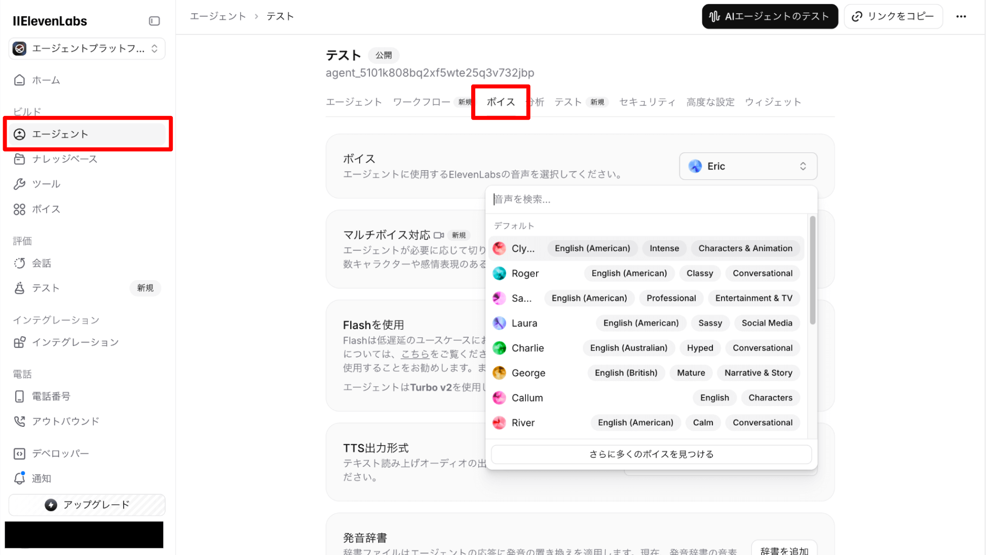 エージェントを作成したら、次に基本設定を行います。まず、エージェントの「声」となる音声を選択します。ElevenLabsの高品質な音声生成ライブラリから選ぶか、独自のボイスをクローンすることも可能です。