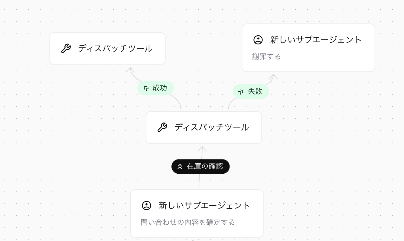「ディスパッチツール(在庫照会システム)」ノードから、「成功(在庫あり)」と「失敗(在庫なし)」という2本のエッジを作成。AIはツールの実行結果を判断し、自動的に適切なルート(「在庫あり」なら決済ノードへ、「在庫なし」なら謝罪ノードへ)を選択します。