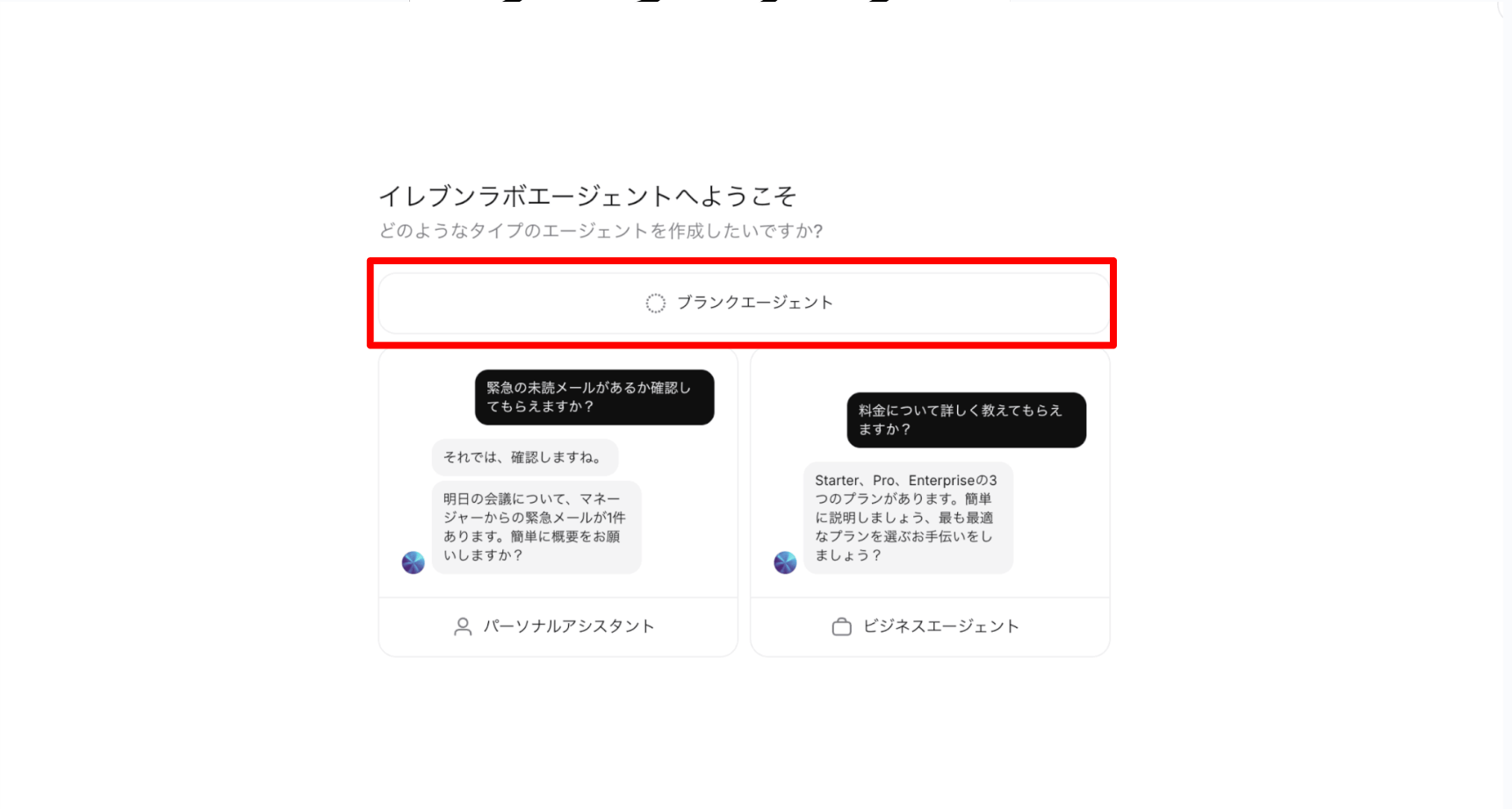 「パーソナル」「ビジネス」は、特定のユースケース向けにあらかじめ最適化された設定やプロンプトが用意されています。Workflowsを使って独自の会話フローをゼロから自由に設計する場合は、「ブランク」を選択するのが基本です。