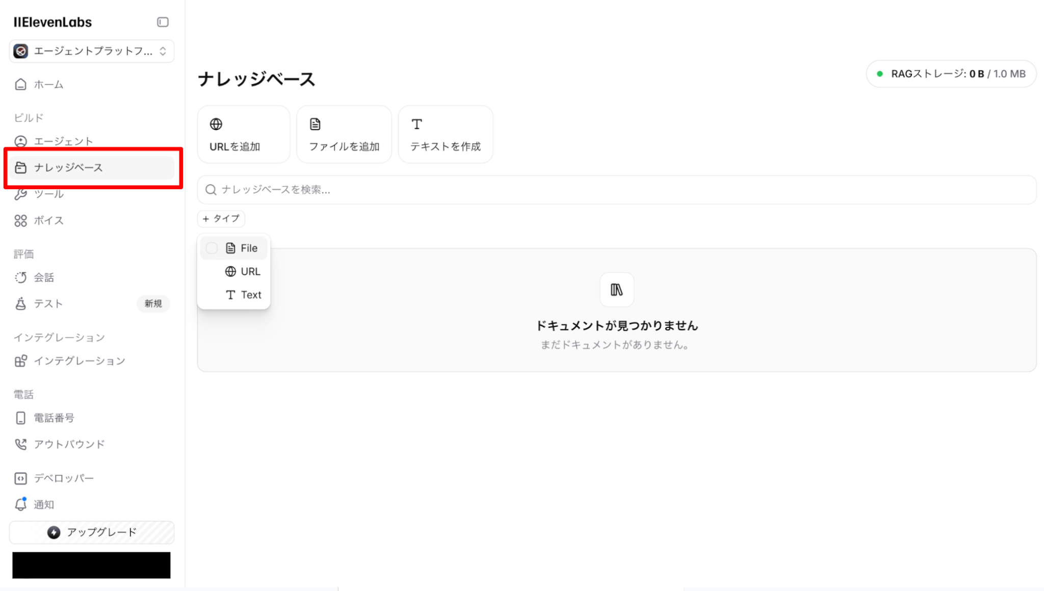 次に、エージェントの知識源となる「ナレッジベース」を設定します。ここには、FAQドキュメントや製品マニュアルなどをアップロードでき、AIはこれらの情報を基にカスタマイズされた応答を生成します。