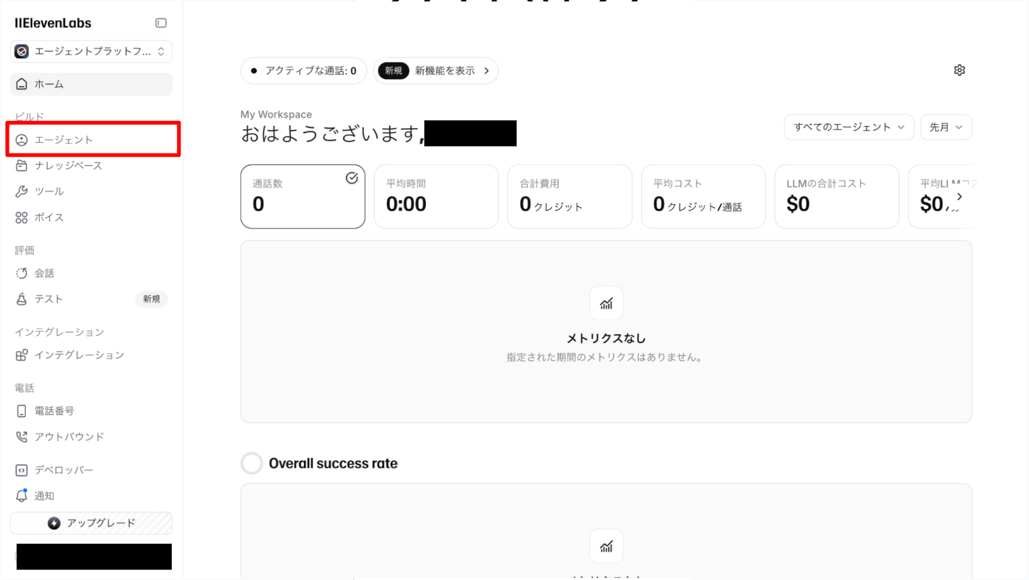 セットアップが完了したら、ElevenLabsのダッシュボードから「エージェント」を選択しエージェントを新規作成します。