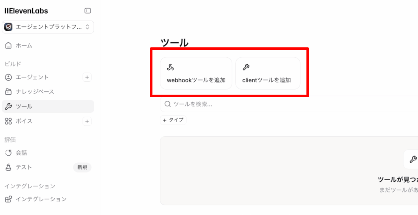API連携方式は、Server tools(Webhook)とClientの2種類があります。Elevenlabsから直接アクセスできる公開APIであればWebhookを、社内ネットワーク上など独自処理が必要な場合はClientを選択しましょう。