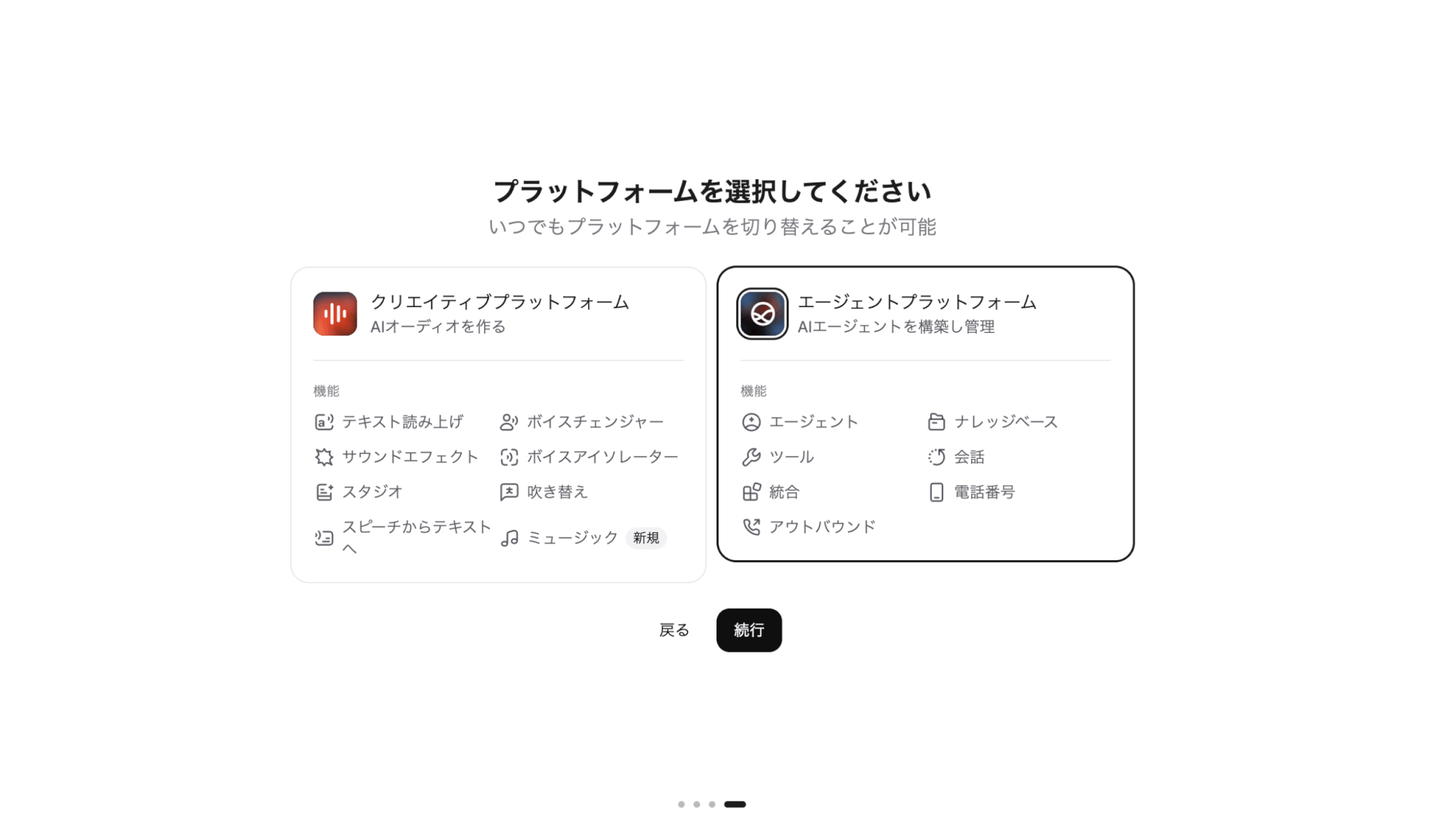 サインアップ後、業種・業界に関するアンケートの他に下記の選択画面が表示されますが、今回は「AIエージェントを作成すること」が目的なので右側の「エージェントプラットフォーム」を選択します