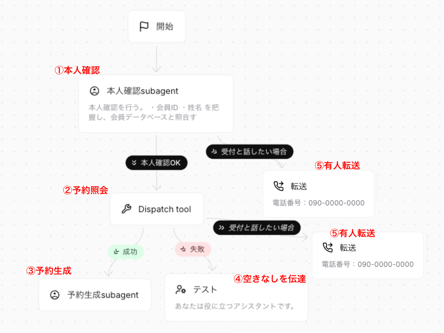 • サブエージェント:本人確認や予約内容のヒアリングなど特定のタスクに特化した小規模なAIエージェント。メインのエージェントから呼び出され、役割分担が明確に。