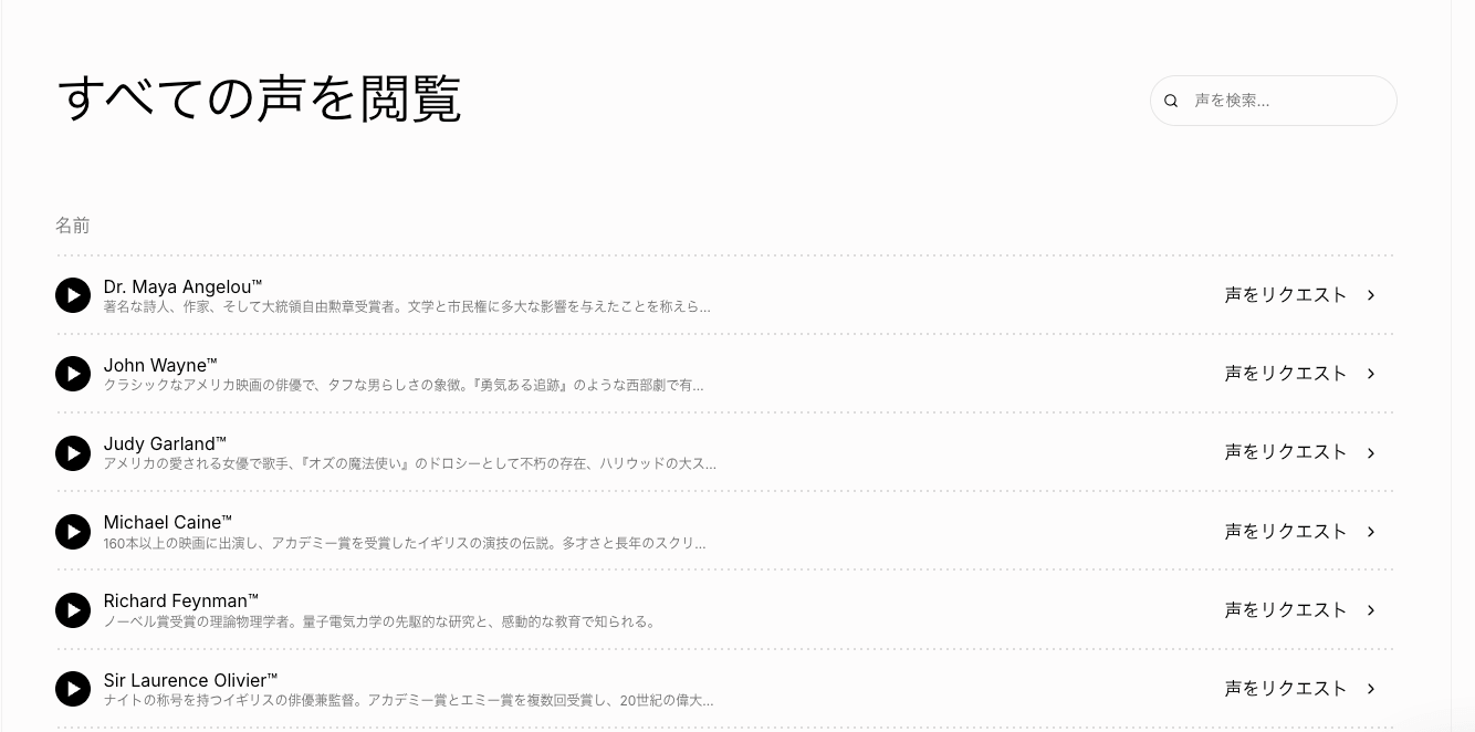 提供される声はすべて権利者の許可を得ており、ElevenLabsの技術によって高品質なAI音声モデルとして再現されています。