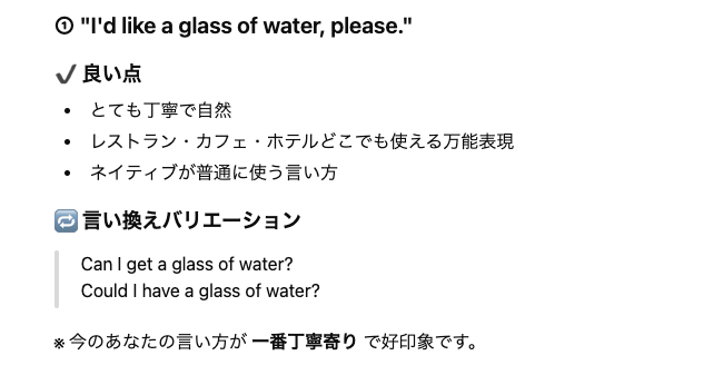 例えば「I want to order」という表現に対して「文法的には間違いではありませんが、レストランでは『I’d like to order』の方がより丁寧で自然です」といった実践的なアドバイスがもらえるでしょう。