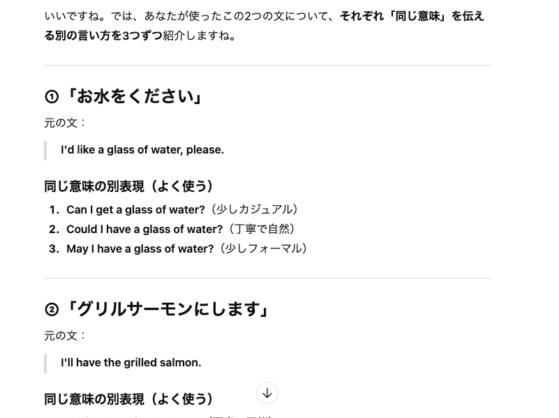 さらに踏み込んだ学習をしたい場合は「同じ意味を伝える別の表現も3つ教えてください」と追加で質問することもできます。