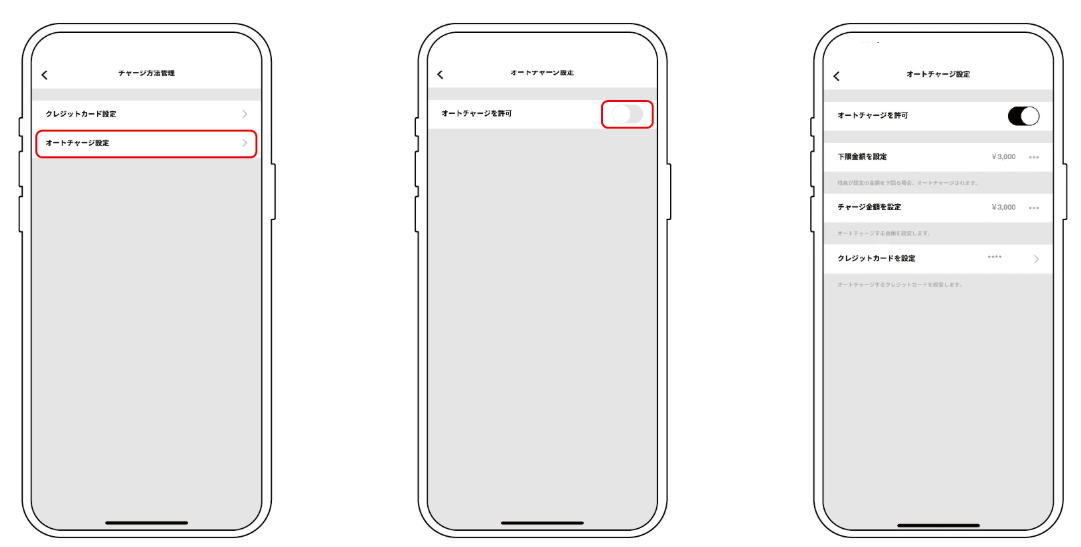 そして「オートチャージを許可」をスワイプし、「下限金額」「チャージ金額」などを設定します。