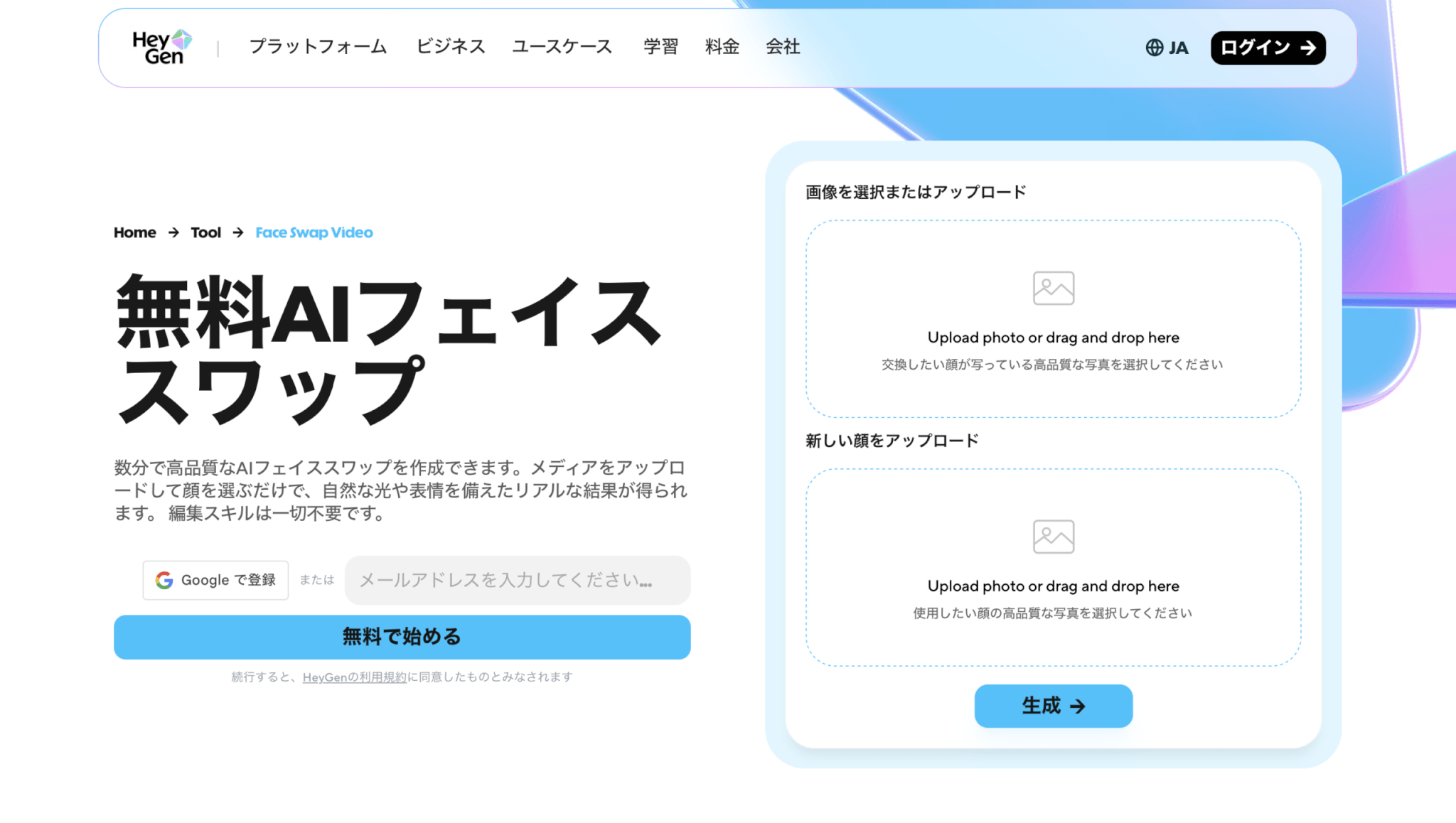 HeyGenは、AIアバター動画生成で知られるAI動画ツールで、「Face Swap Video」機能を使うことで動画内の人物の顔を別の顔に入れ替えることができます。