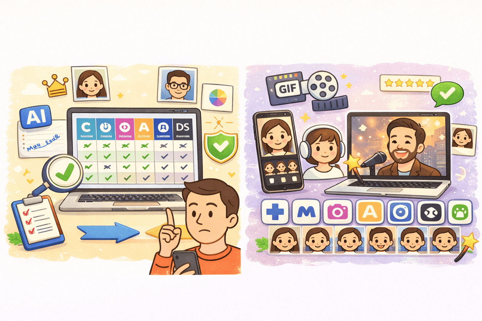 写真の顔を入れ替えられるアプリもあれば、動画やGIFの顔合成に対応した高機能なWebサービスもあります。また、商用利用の可否や登録の有無、プライバシー管理などもツールによって異なります。