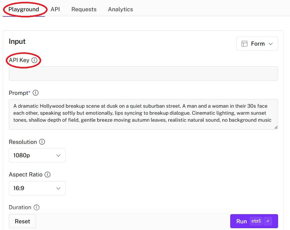 モデルカードの「API」タブで推奨パラメータを確認し、入力欄にテキストや参照画像・動画を設定して実行すると、その場で結果とログを確認できます。
