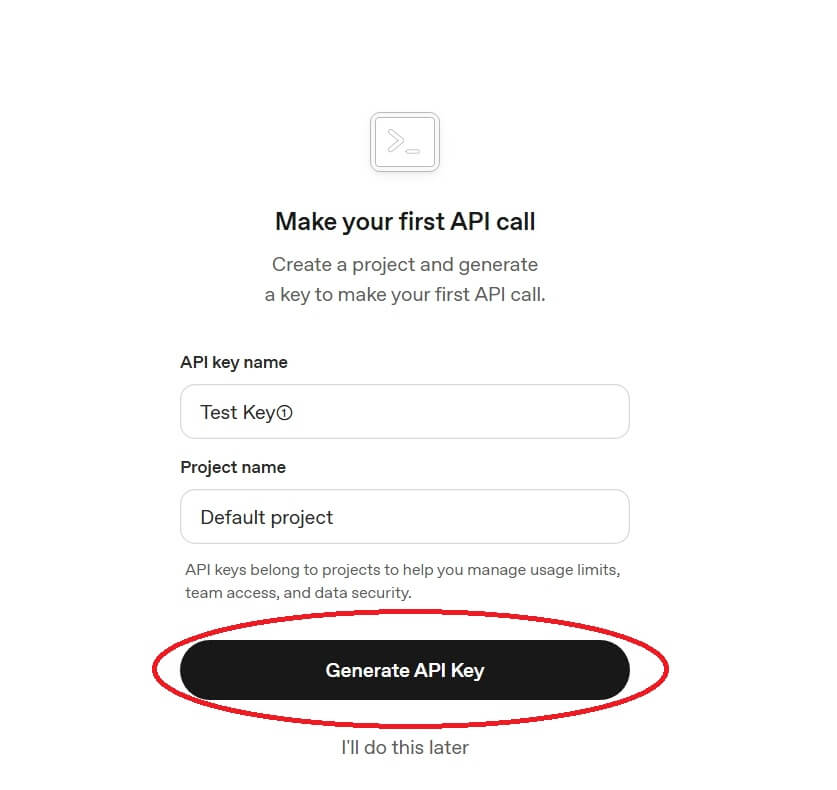入力後、「Generate API key」をクリックします。
