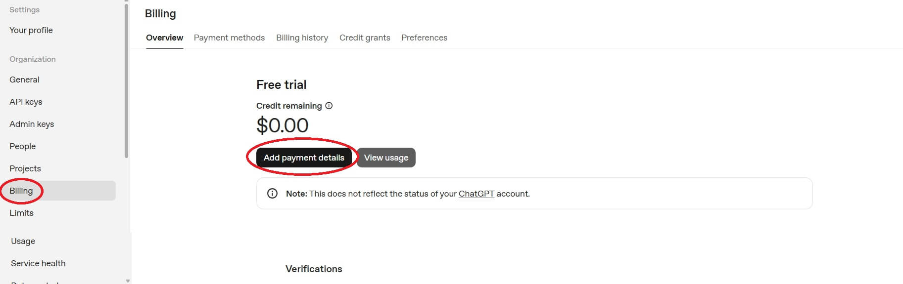 左の項目の「Billing」を選択し「Add payment details」をクリックします。