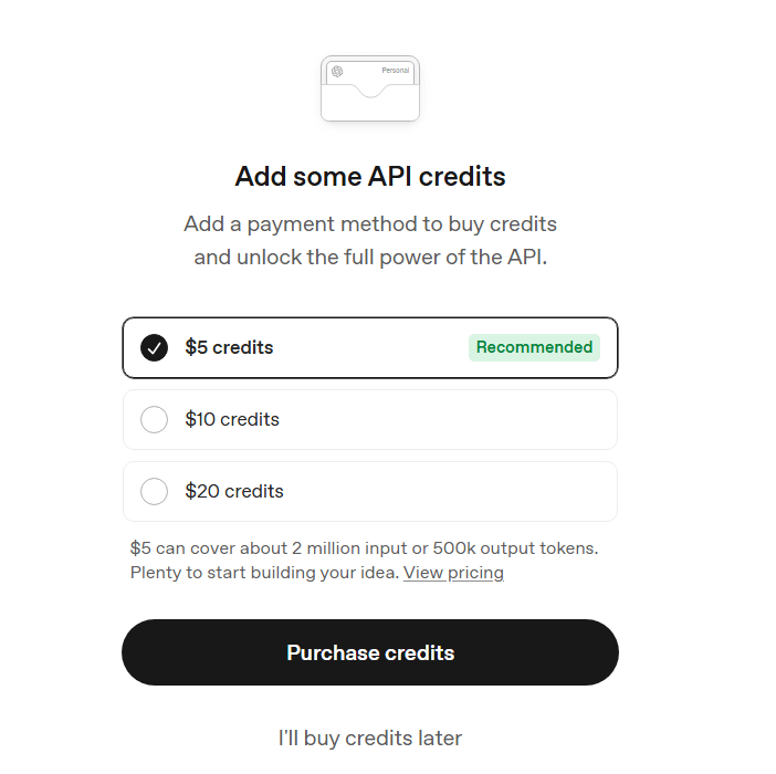 fal.aiではプリペイド方式でクレジットを事前購入する方法と、外部キー(OpenAI APIキー)を直接使用する方法の2つが選択できます。