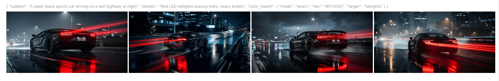 JSON構造化プロンプトとHexカラーコード(#FF0000など)を組み合わせることで、指定した箇所のカラーを正確に制御できます。