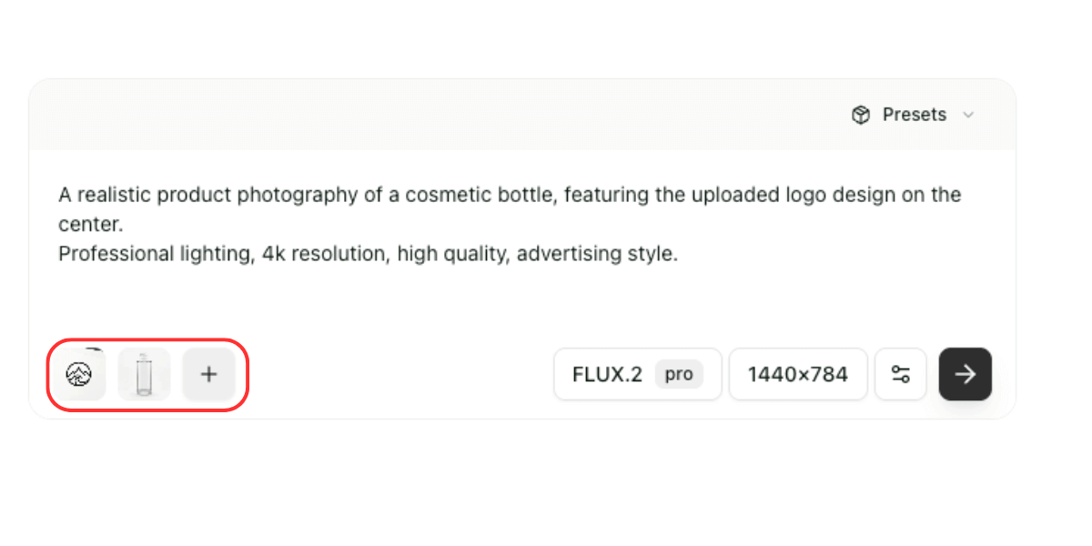 (訳:アップロードされたロゴデザインを中央に配置した、化粧品ボトルのリアルな商品写真。プロのライティング、4k解像度。)