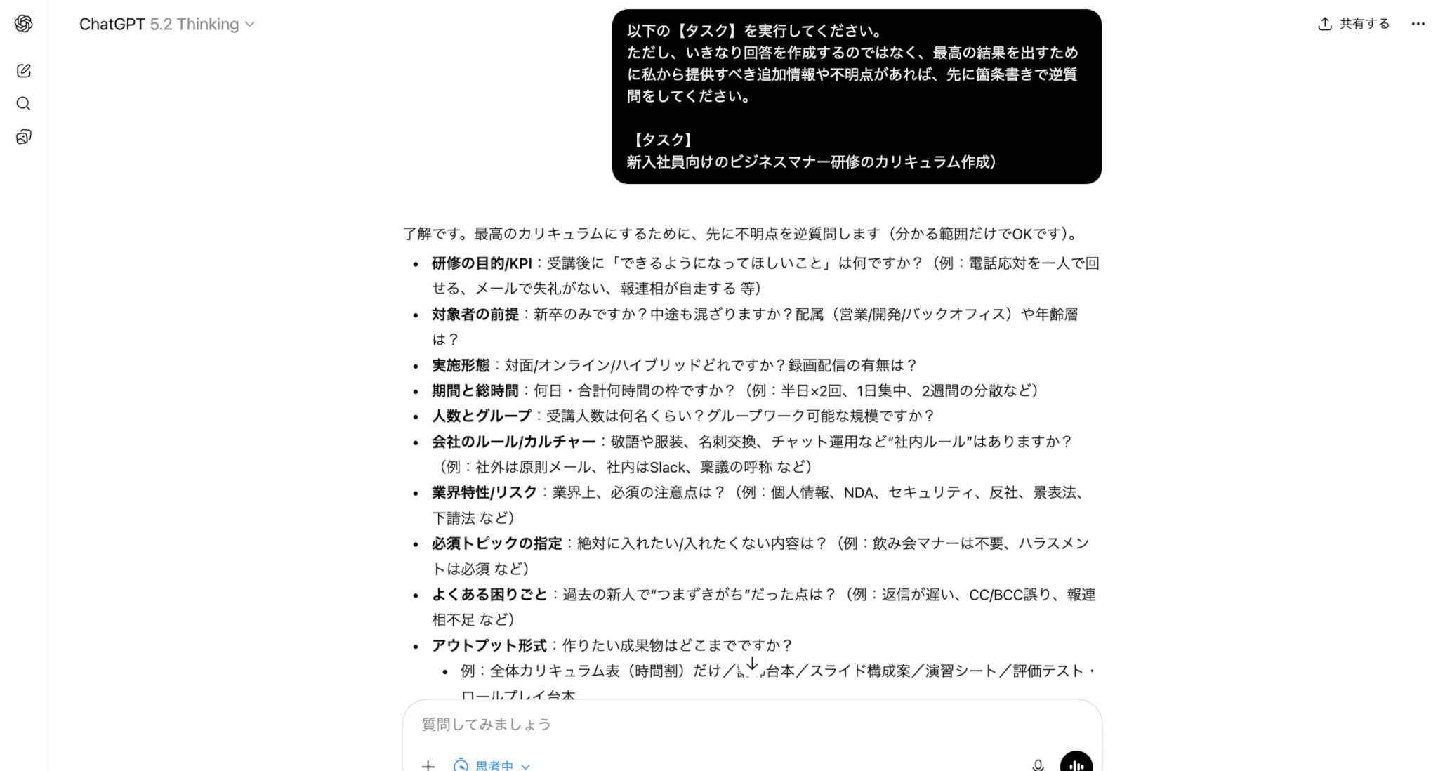 (例:新入社員向けのビジネスマナー研修のカリキュラム作成)