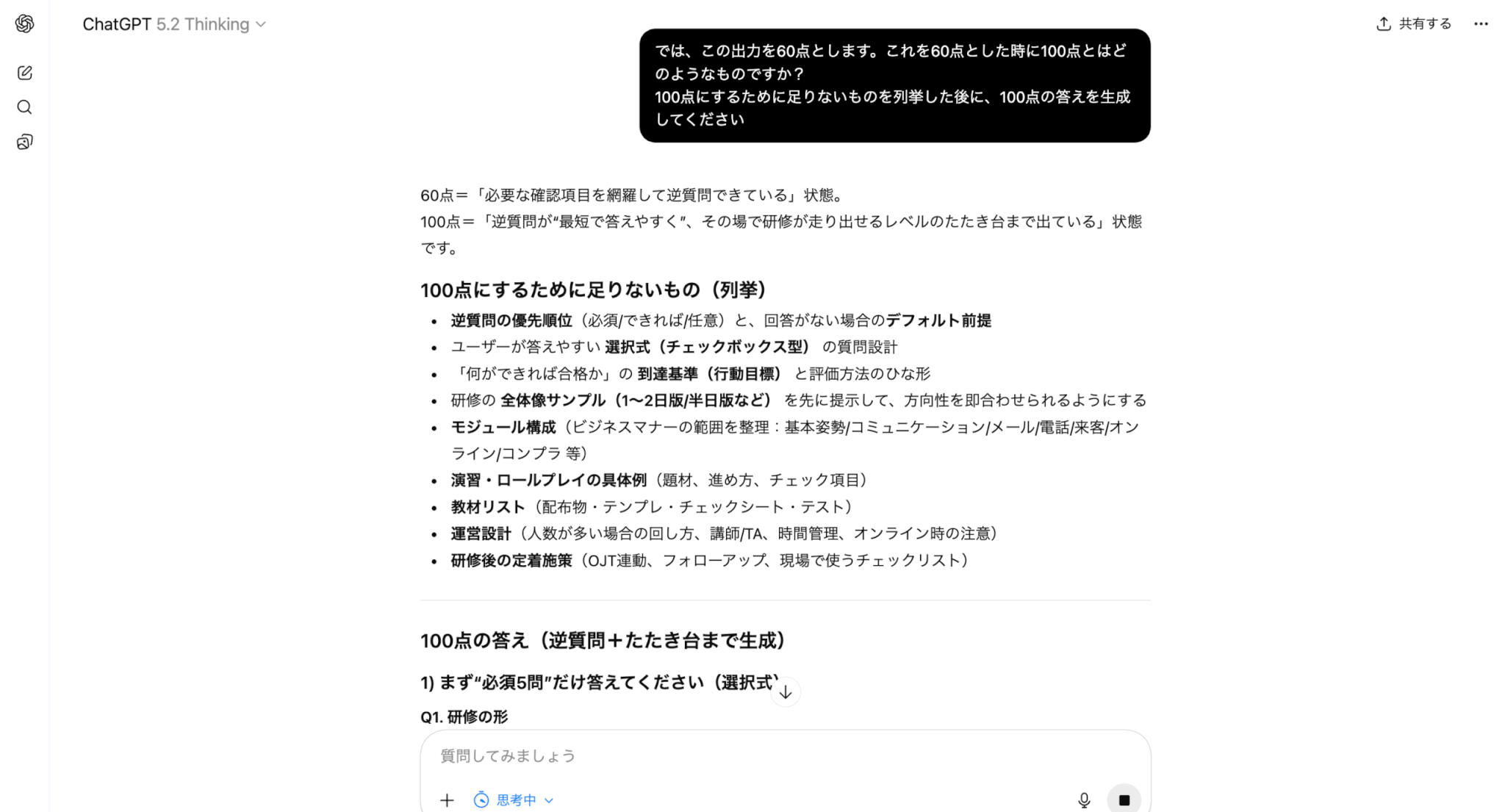 単に「もっと良くして」と修正を依頼するのではなく、出力された回答をあえて「60点」と仮定し、AI自身に「100点の回答との差分」を分析させます。