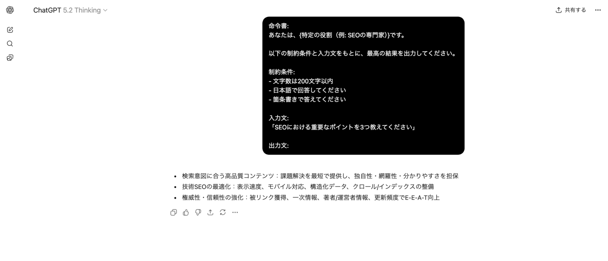 例えば、SEOに特化した情報を求める場合、このテンプレートを使用して、具体的かつ的確なアドバイスを得ることができます。