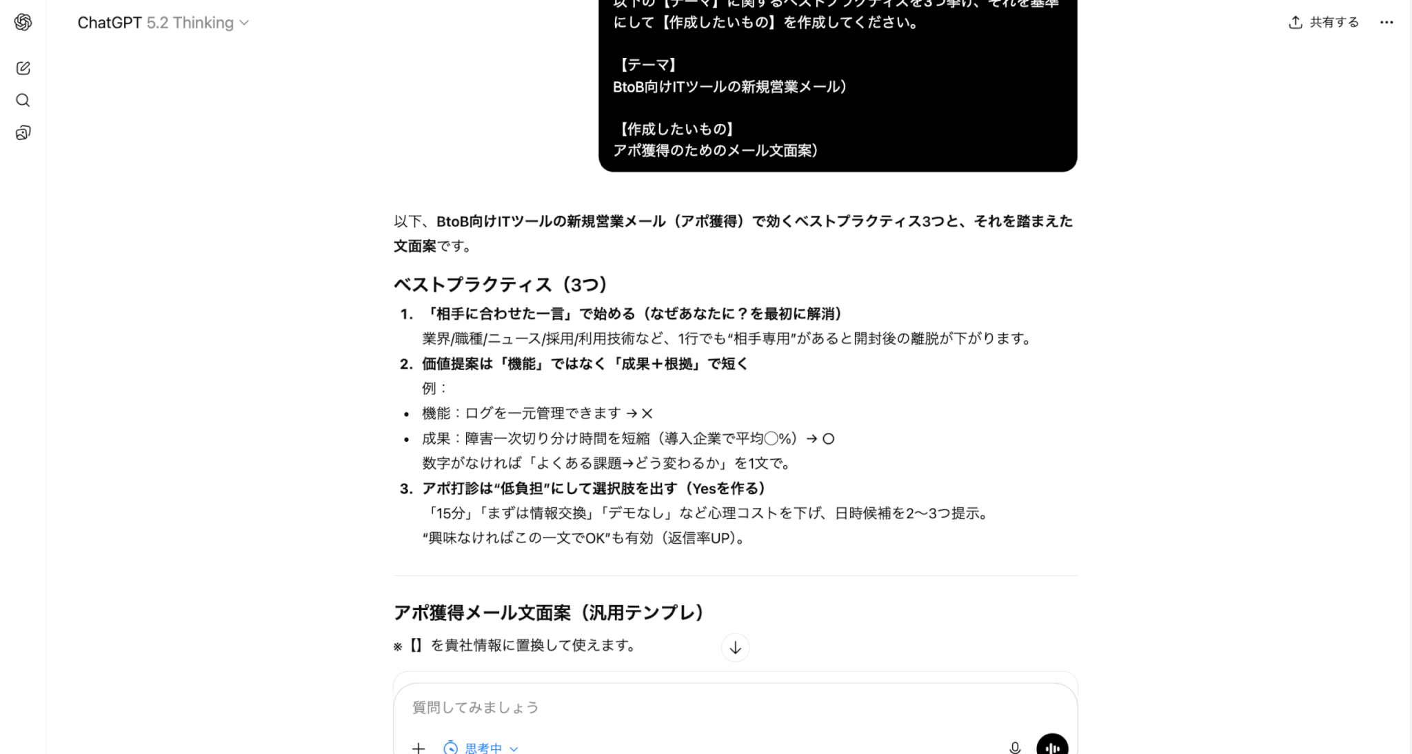 ベストプラクティスの出力は、自分が正解やセオリーを知らない業務(新規プロジェクトの企画や、未経験の作業など)をAIに手伝ってもらうシーンで有効なテクニックです。