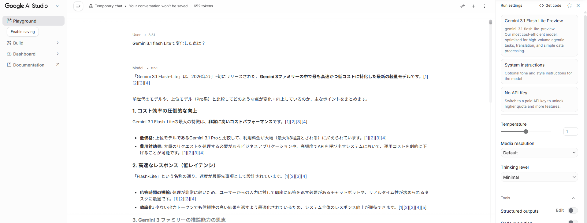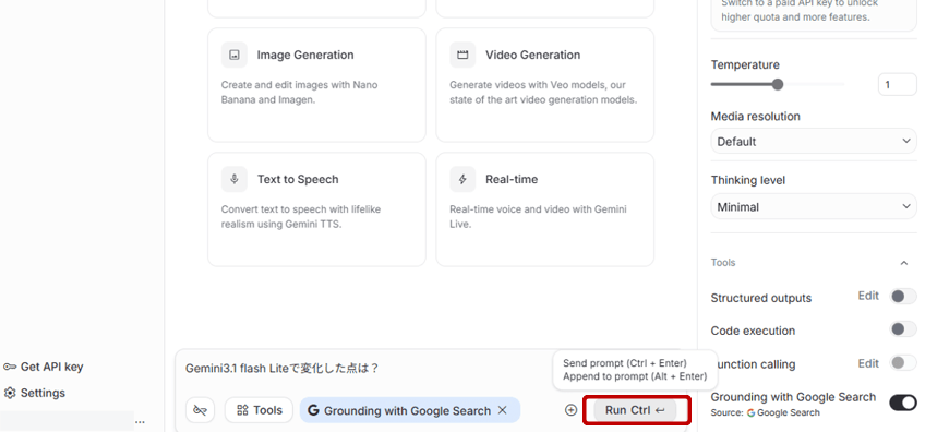 右側のモデル選択メニュー(Run settings)から「Gemini 3.1 Flash-Lite」を選択します。