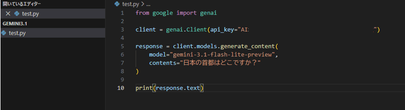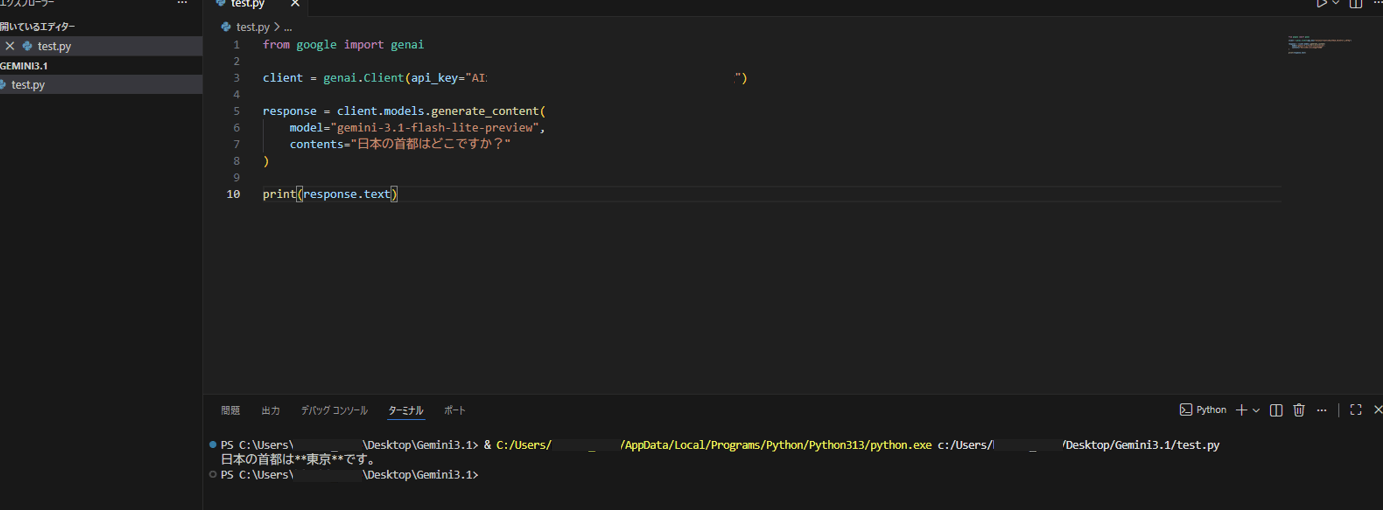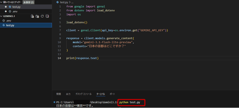 「日本の首都は東京です。」と出力が表示されれば、Gemini 3.1 Flash-Liteの動作確認は完了です。