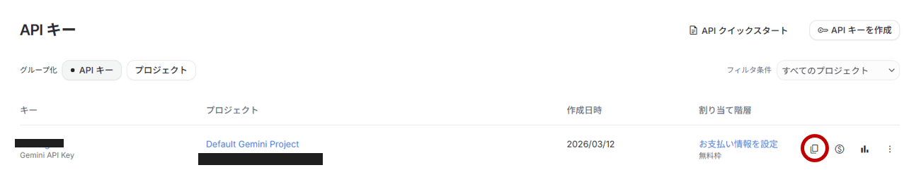 生成されたキーをコピーします。割り当て結果の下部にある赤い円で囲まれたコピーのマークをクリックするとコピーされます。
