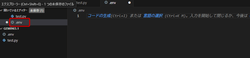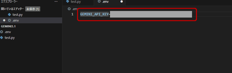 取得したAPIキーは、test.py などのコードファイルに直接書き込まないようにしましょう。コードファイルをそのままGitHubにアップロードすると、APIキーが外部に漏れて悪用されるリスクがあります。