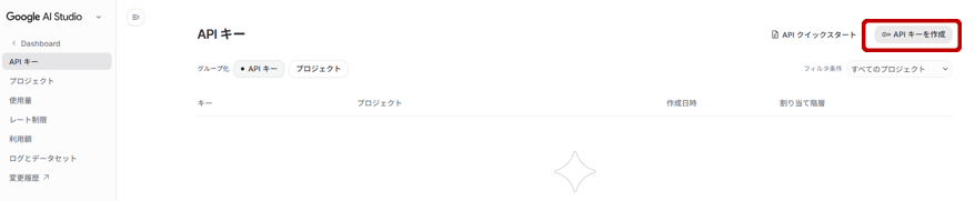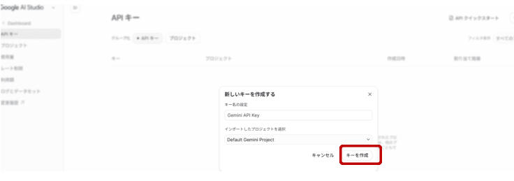 Google AI Studioの左メニューから「APIキー」を選択し、「APIキーを作成」をクリックします。
