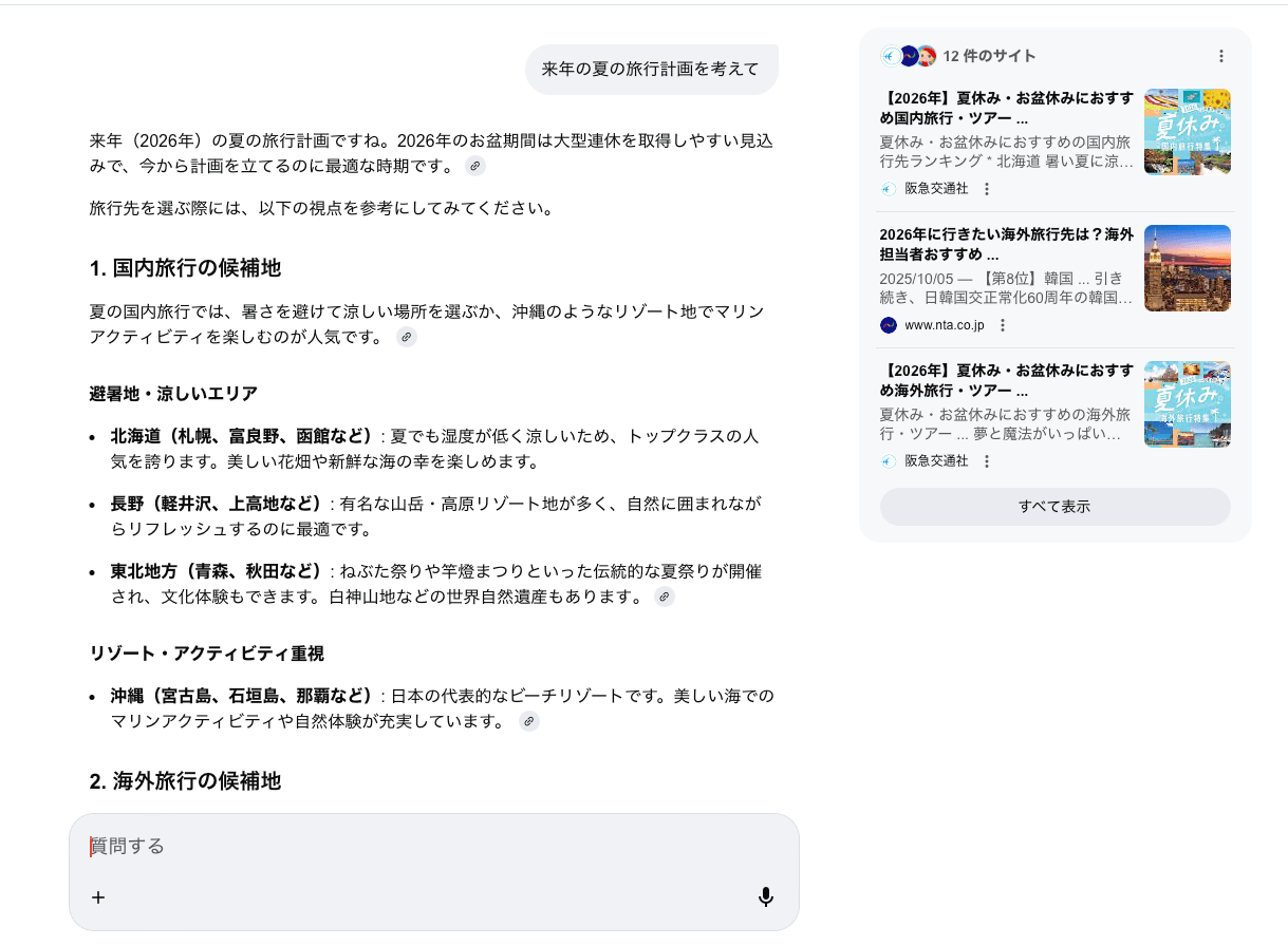 今回は、「来年の夏の旅行計画を考えて」と入力します。